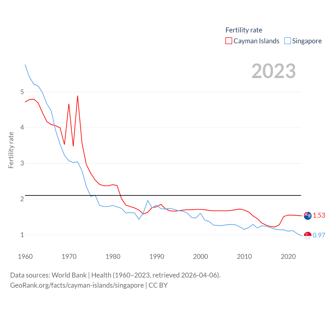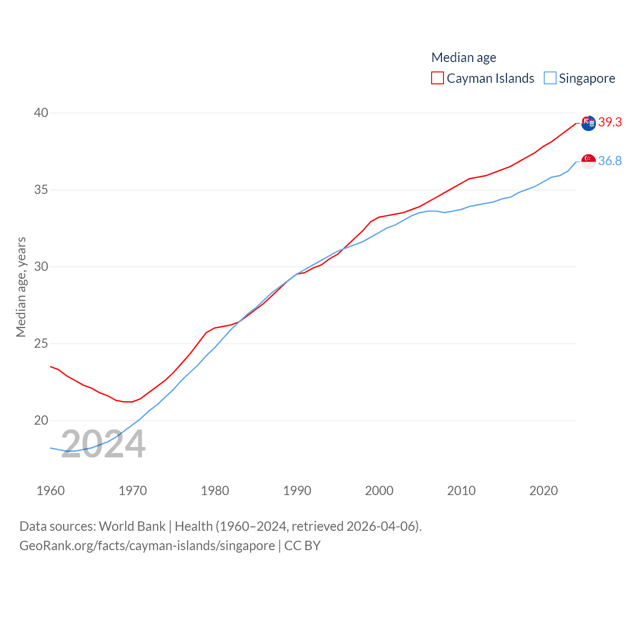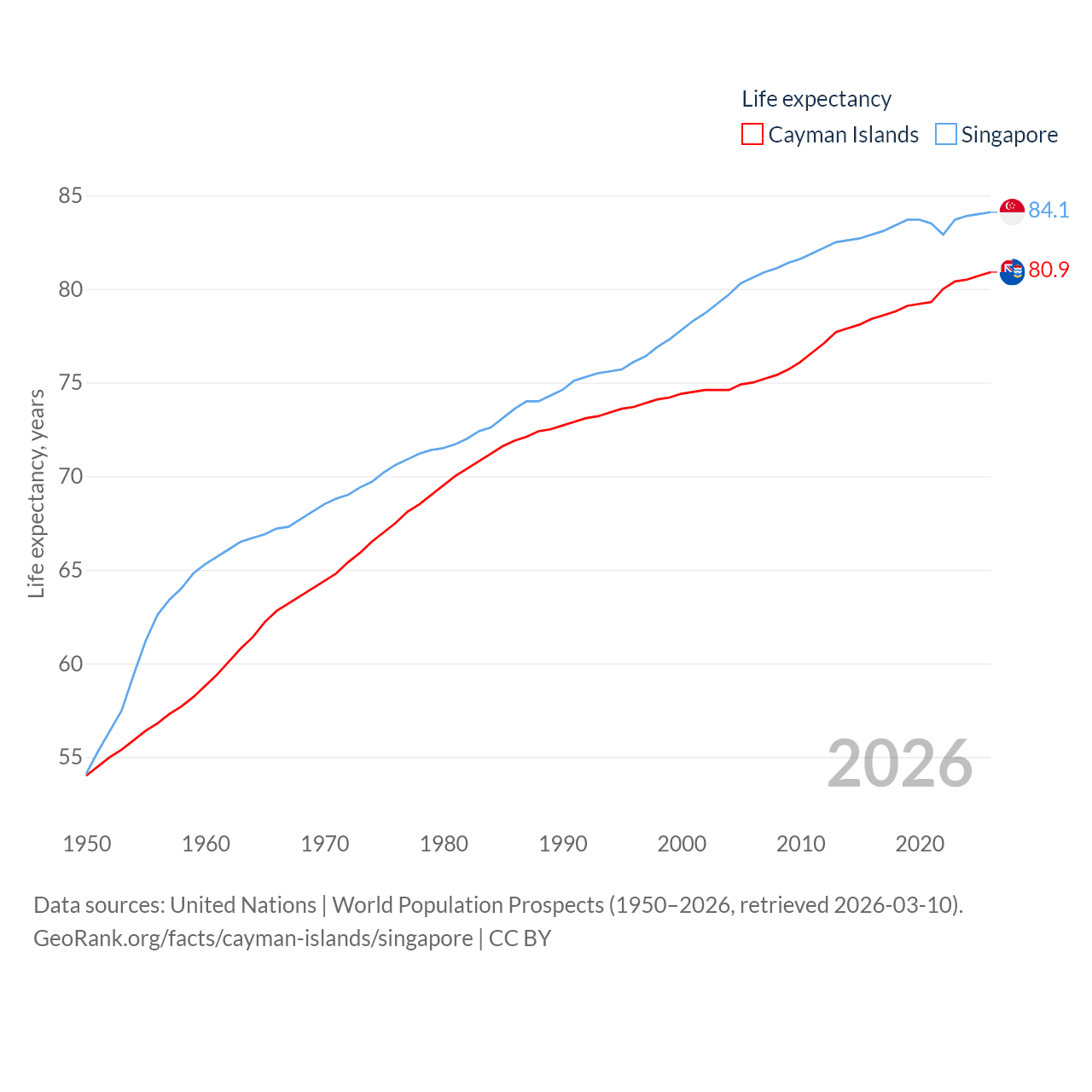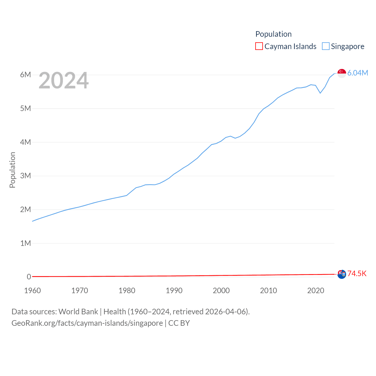 The Cayman Islands has a population of 74.5K (ranked 187/197), compared with 6.04M in Singapore (ranked 113/197). The Cayman Islands' land area is 92.7 sq mi versus 277.2 sq mi for Singapore (ranked 190th vs. 177th).