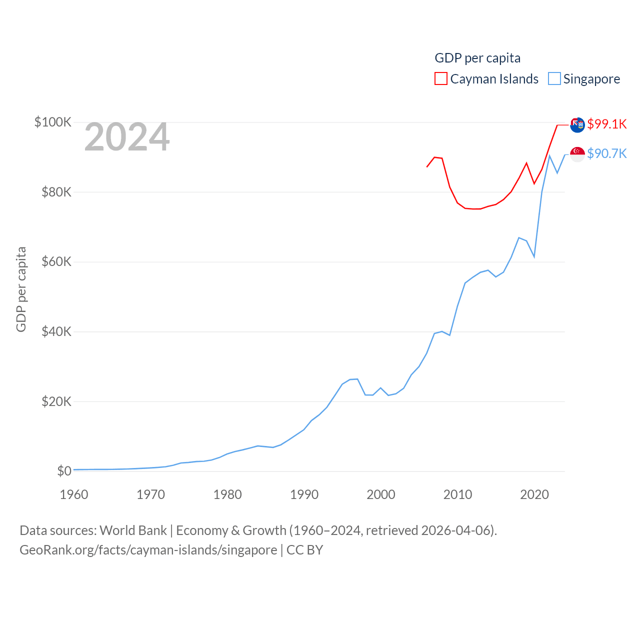 By GDP, The Cayman Islands ranks 158/197 ($7.24B) and Singapore ranks 28/197 ($547B). By GDP per capita, The Cayman Islands ranks 6/197 ($99,144), while Singapore ranks 7/197 ($90,674).
