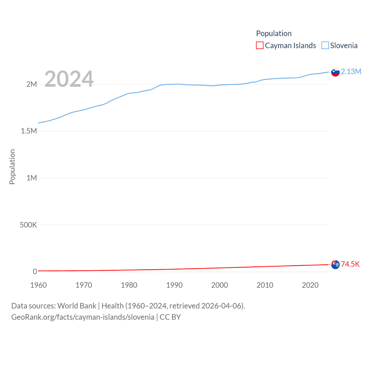 The Cayman Islands has a population of 74.5K (ranked 187/197), compared with 2.13M in Slovenia (ranked 147/197). The Cayman Islands' land area is 92.7 sq mi versus 7,774 sq mi for Slovenia (ranked 190th vs. 151st).