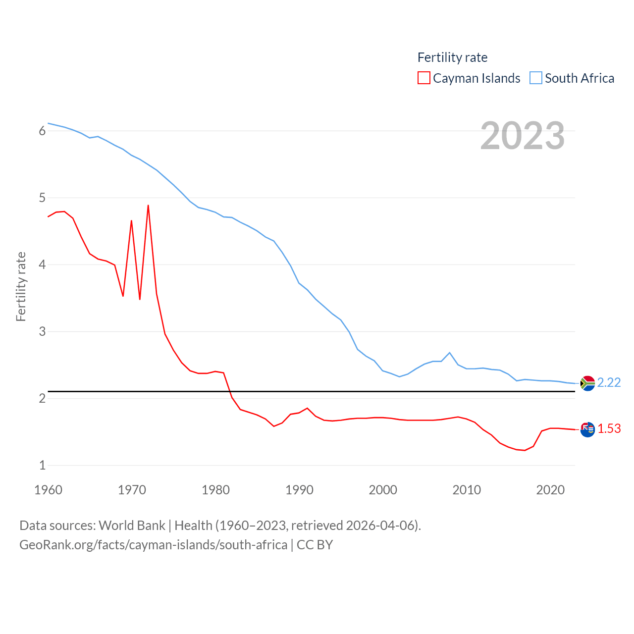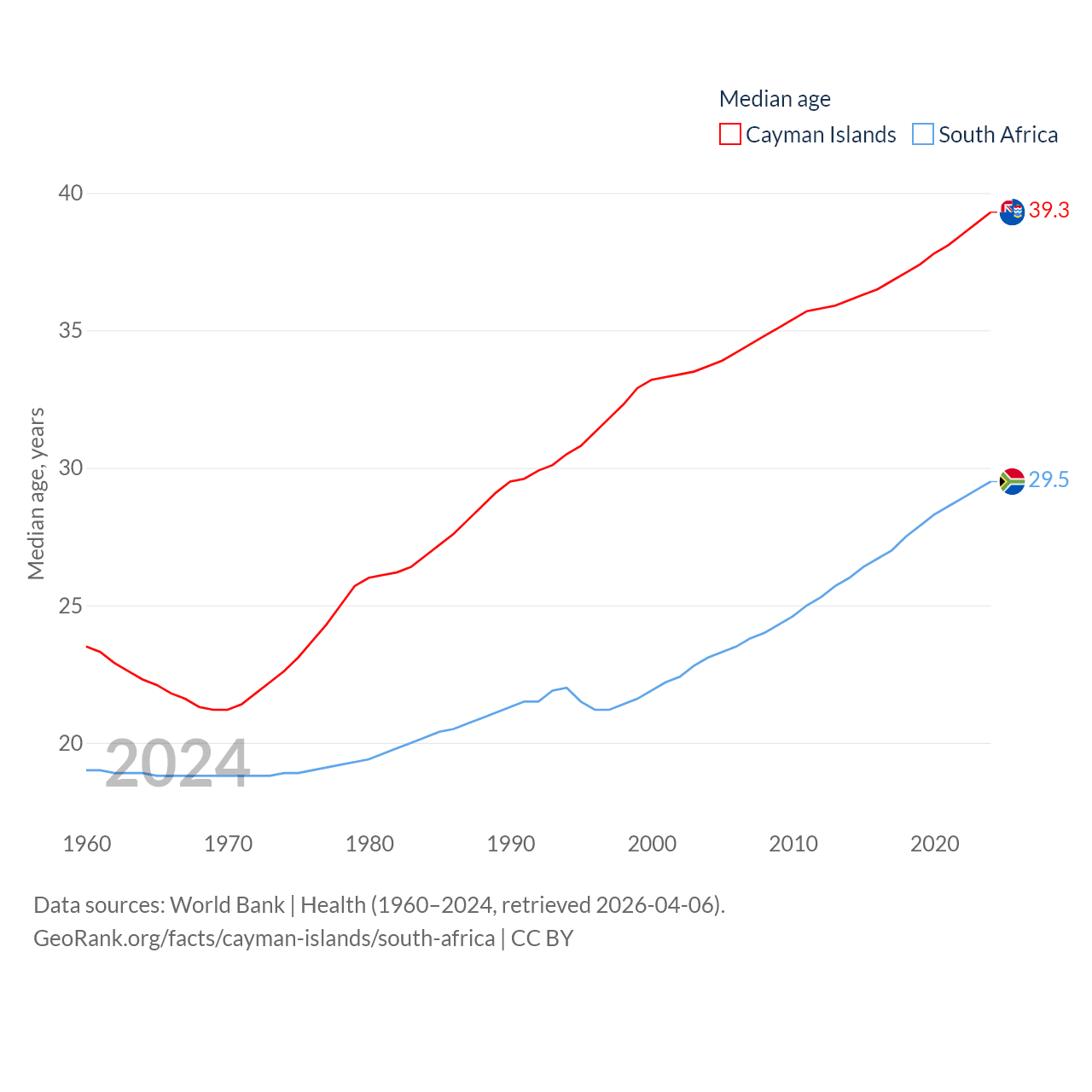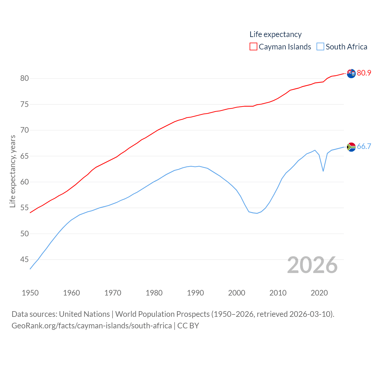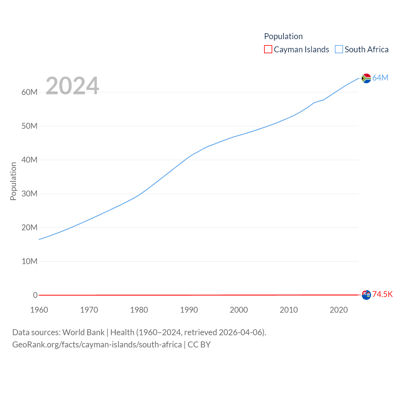 The Cayman Islands has a population of 74.5K (ranked 187/197), compared with 64M in South Africa (ranked 24/197). The Cayman Islands' land area is 92.7 sq mi versus 468,377 sq mi for South Africa (ranked 190th vs. 24th).