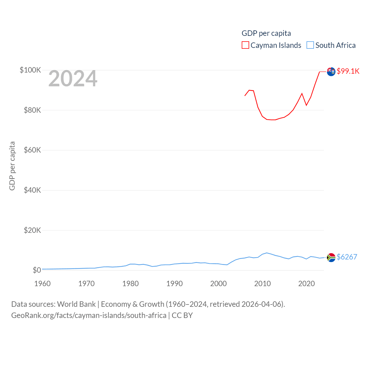 By GDP, The Cayman Islands ranks 158/197 ($7.24B) and South Africa ranks 40/197 ($401B). By GDP per capita, The Cayman Islands ranks 6/197 ($99,144), while South Africa ranks 111/197 ($6,267).