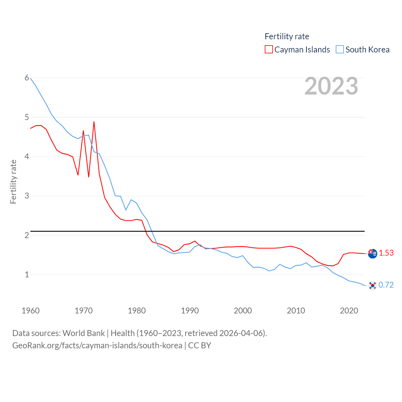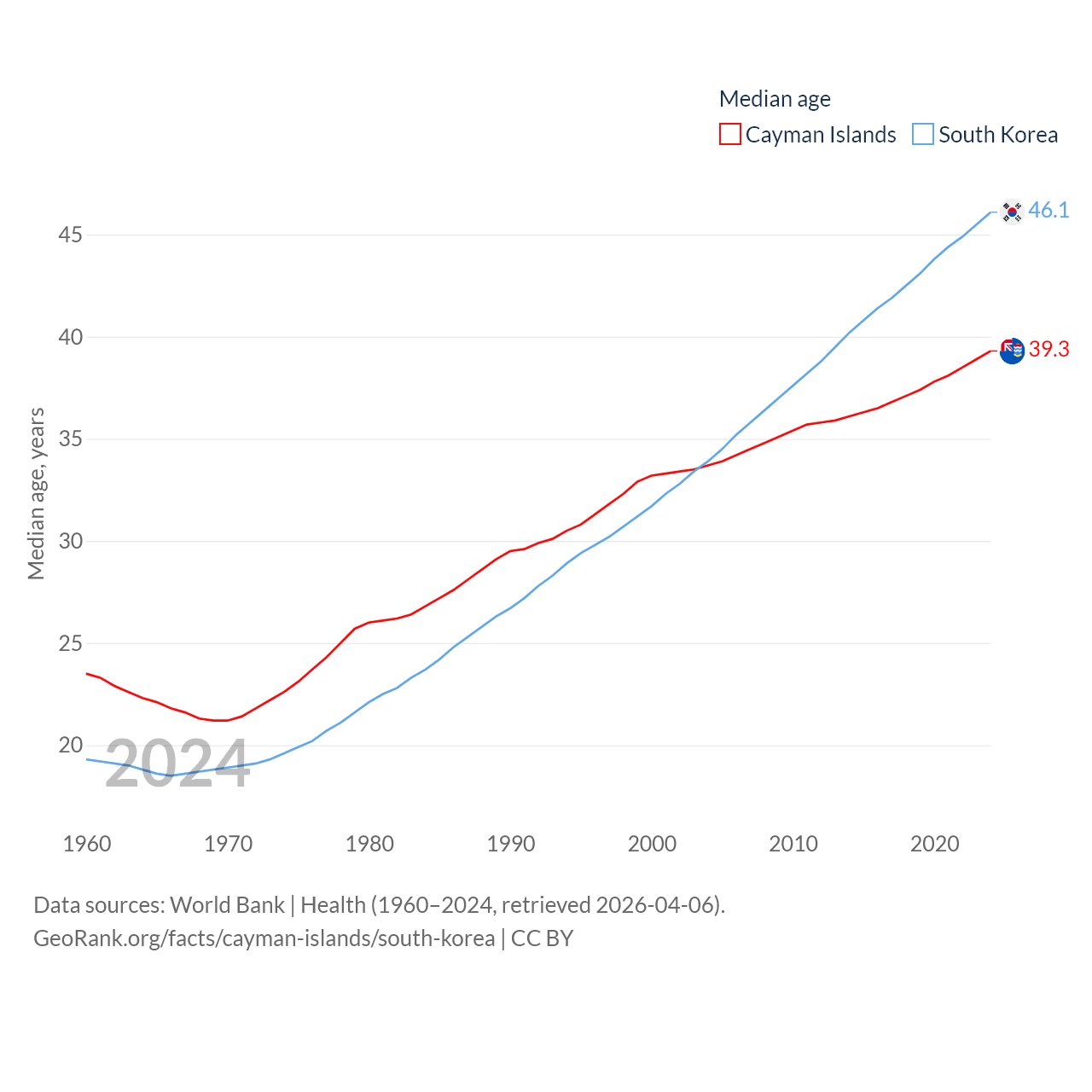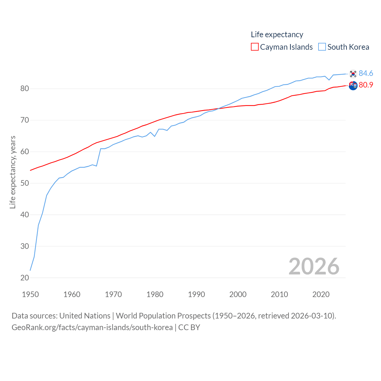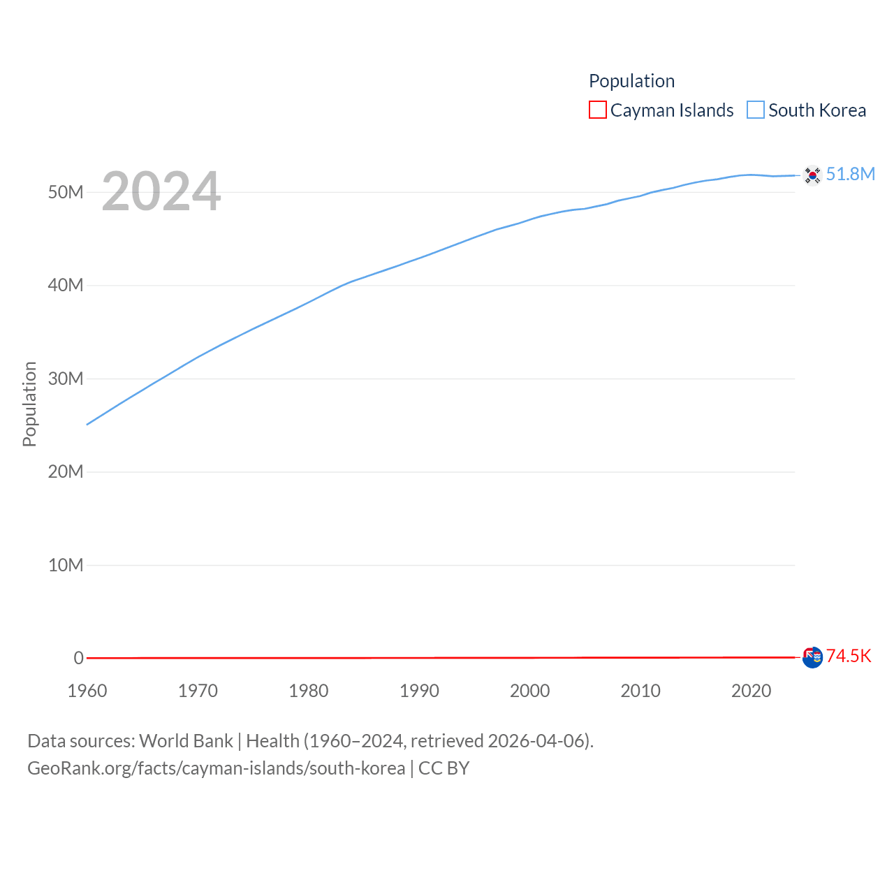 The Cayman Islands has a population of 74.5K (ranked 187/197), compared with 51.8M in South Korea (ranked 29/197). The Cayman Islands' land area is 92.7 sq mi versus 37,684 sq mi for South Korea (ranked 190th vs. 105th).