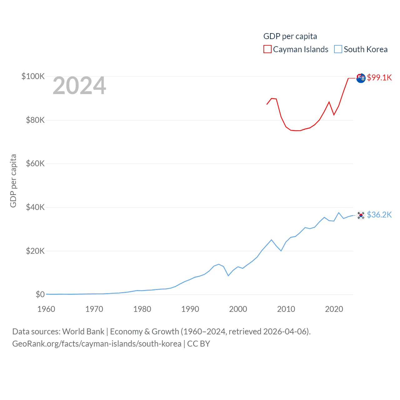 By GDP, The Cayman Islands ranks 158/197 ($7.24B) and South Korea ranks 12/197 ($1.88T). By GDP per capita, The Cayman Islands ranks 6/197 ($99,144), while South Korea ranks 31/197 ($36,239).