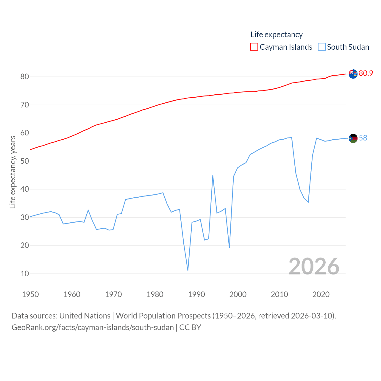 Cayman Islands vs. South Sudan life expectancy calculator