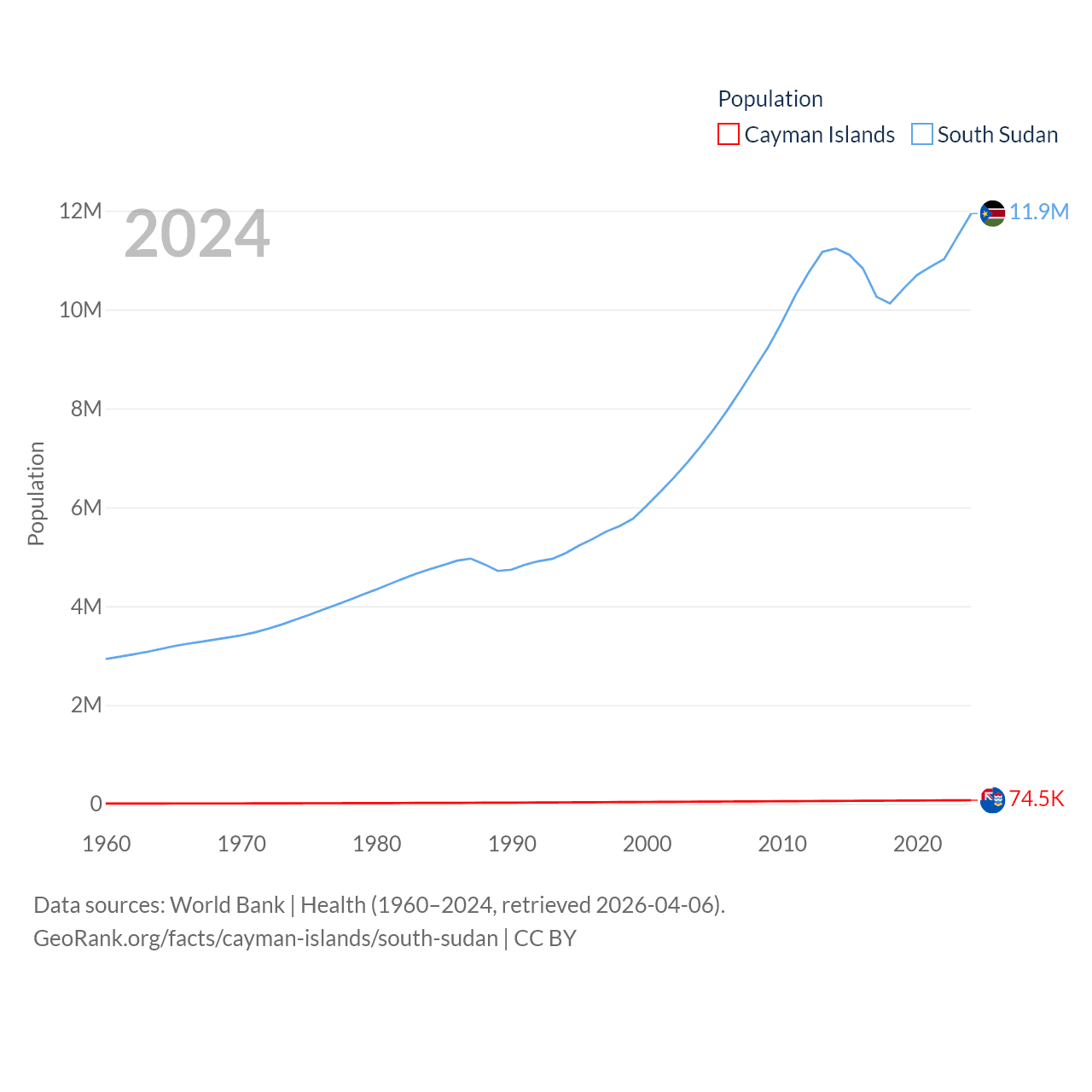 The Cayman Islands has a population of 74.5K (ranked 187/197), compared with 11.9M in South Sudan (ranked 81/197). The Cayman Islands' land area is 92.7 sq mi versus 243,990 sq mi for South Sudan (ranked 190th vs. 41st).