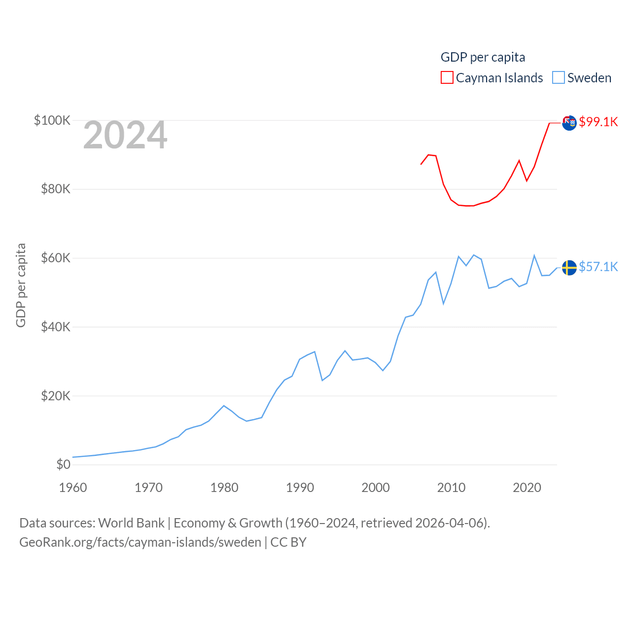 By GDP, The Cayman Islands ranks 158/197 ($7.24B) and Sweden ranks 26/197 ($604B). By GDP per capita, The Cayman Islands ranks 6/197 ($99,144), while Sweden ranks 17/197 ($57,117).