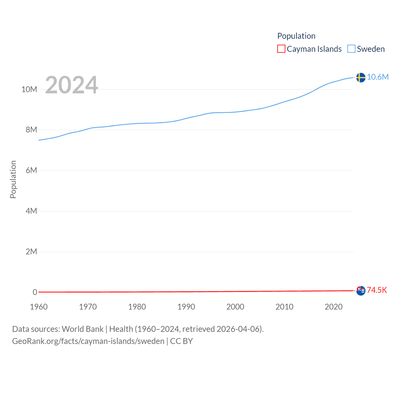 The Cayman Islands has a population of 74.5K (ranked 187/197), compared with 10.6M in Sweden (ranked 93/197). The Cayman Islands' land area is 92.7 sq mi versus 157,248 sq mi for Sweden (ranked 190th vs. 58th).