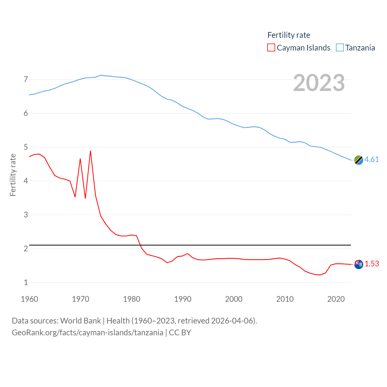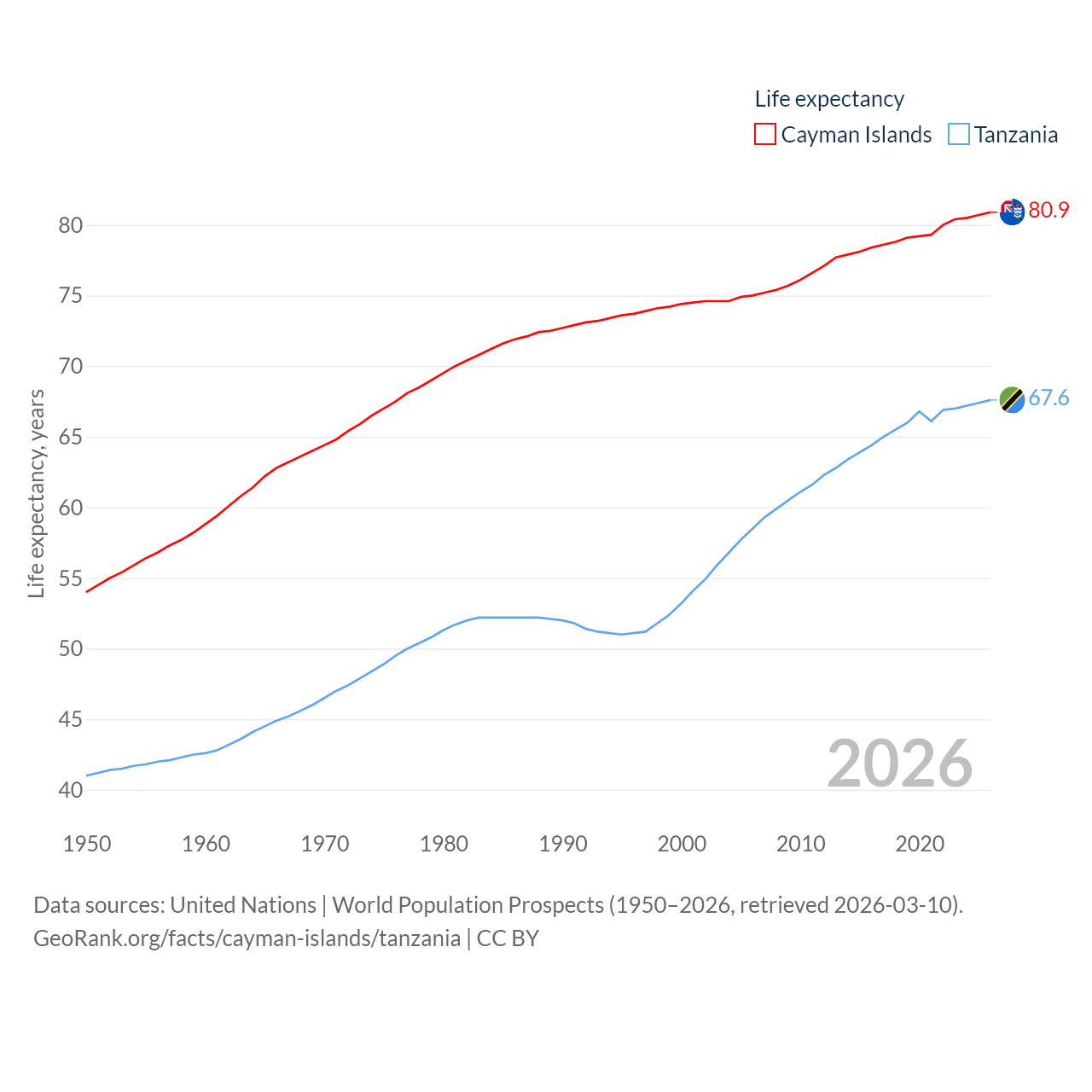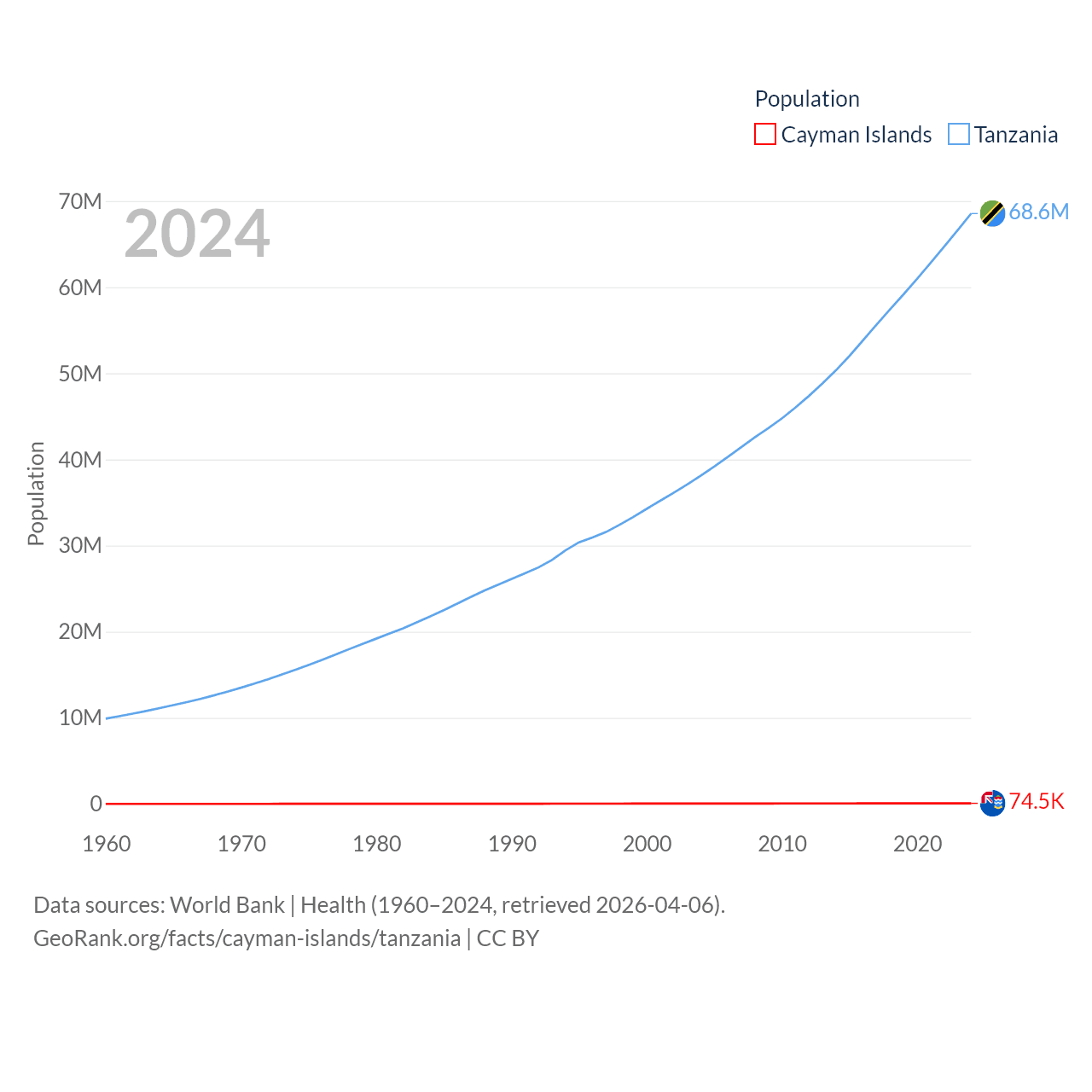 The Cayman Islands has a population of 74.5K (ranked 187/197), compared with 68.6M in Tanzania (ranked 22/197). The Cayman Islands' land area is 92.7 sq mi versus 342,009 sq mi for Tanzania (ranked 190th vs. 31st).