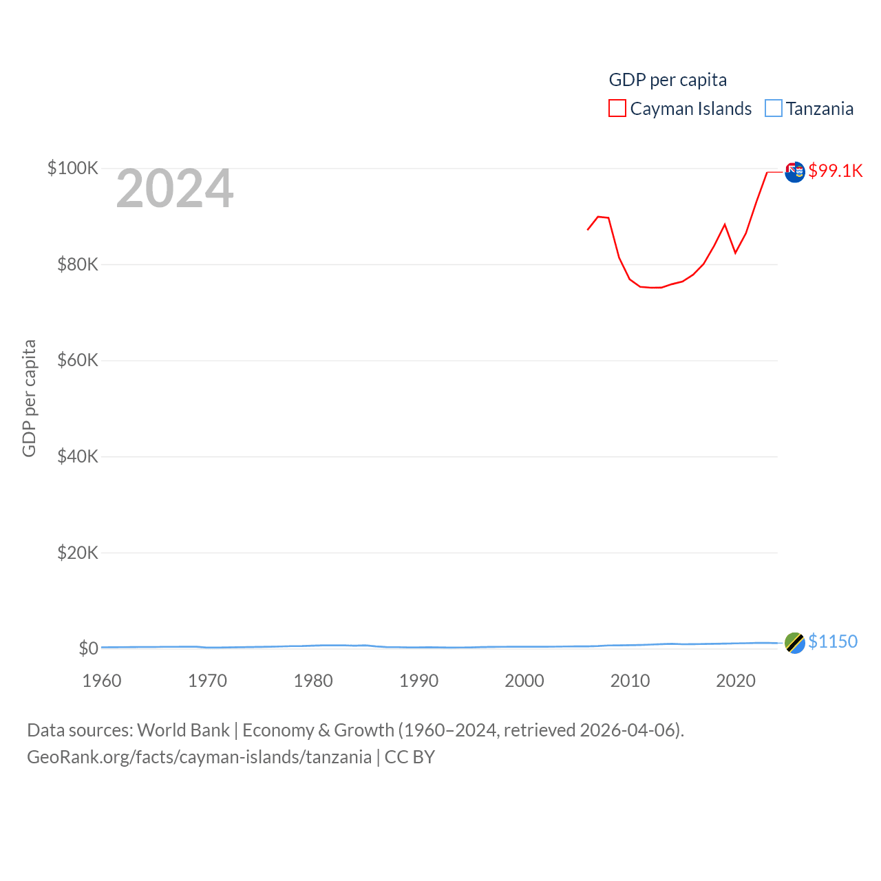 By GDP, The Cayman Islands ranks 158/197 ($7.24B) and Tanzania ranks 82/197 ($78.8B). By GDP per capita, The Cayman Islands ranks 6/197 ($99,144), while Tanzania ranks 170/197 ($1,150).