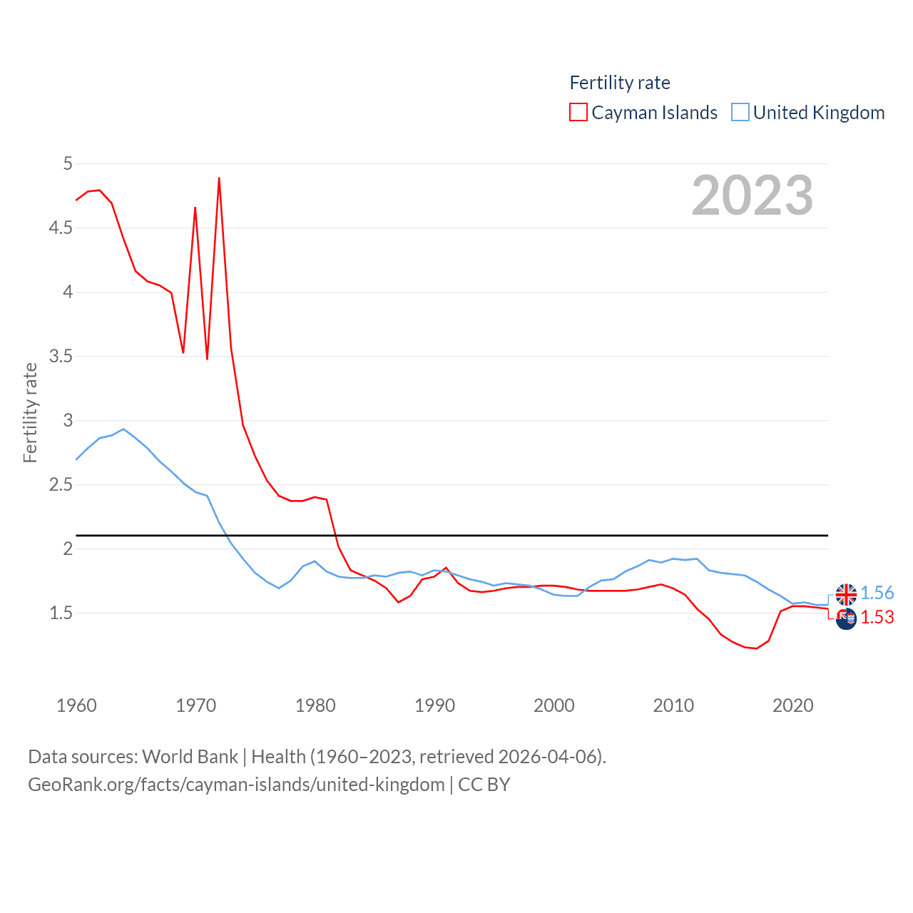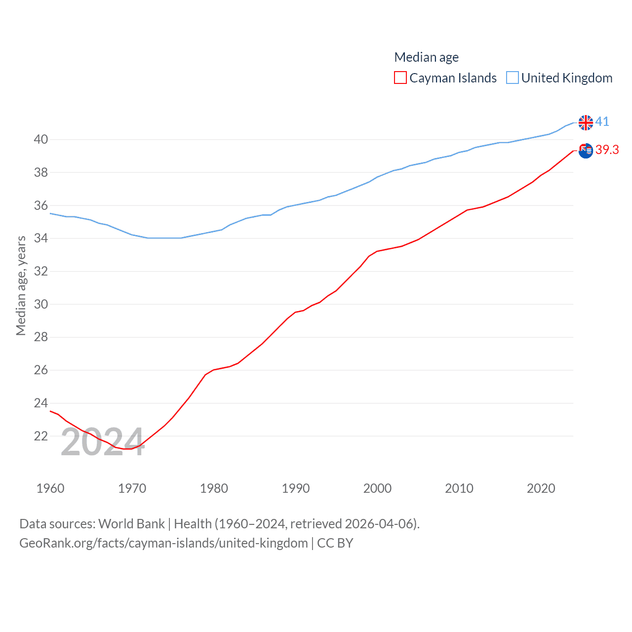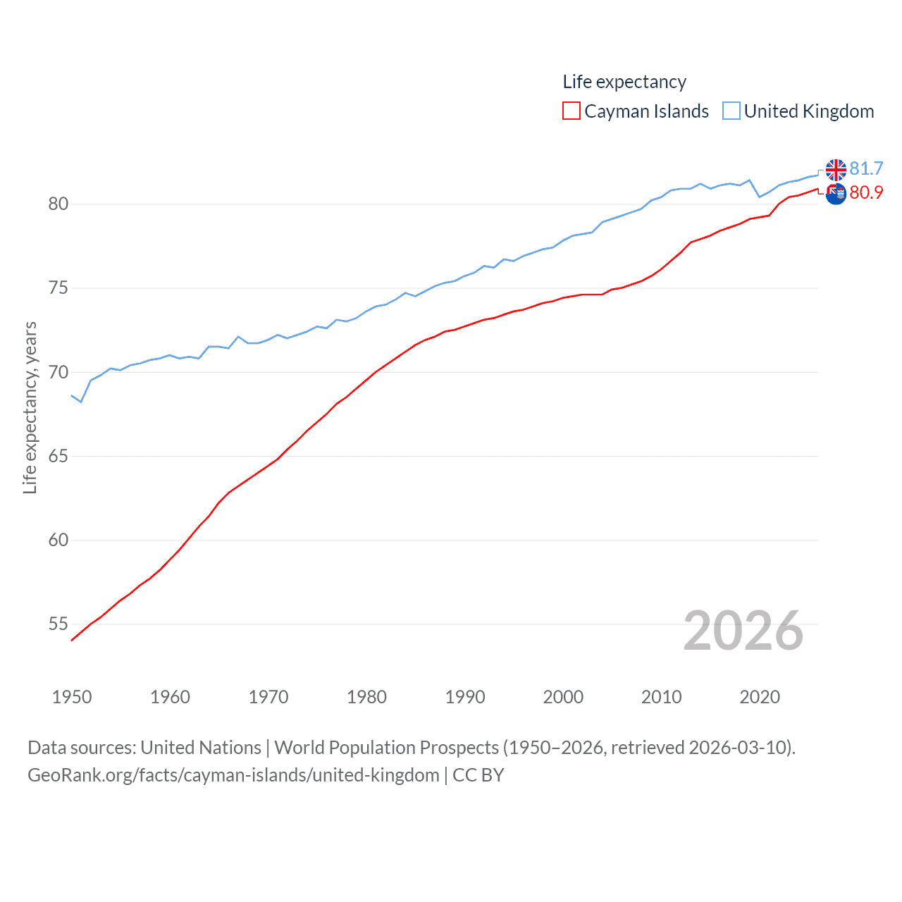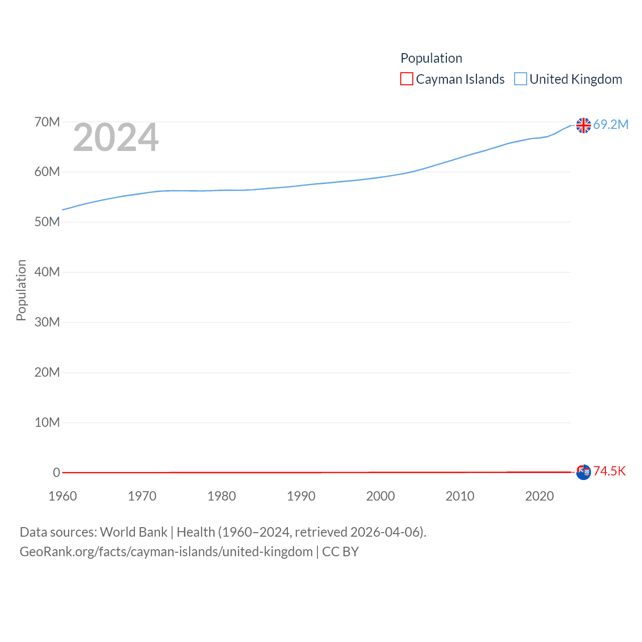 The Cayman Islands has a population of 74.5K (ranked 187/197), compared with 69.2M in The United Kingdom (ranked 21/197). The Cayman Islands' land area is 92.7 sq mi versus 93,410 sq mi for The United Kingdom (ranked 190th vs. 78th).