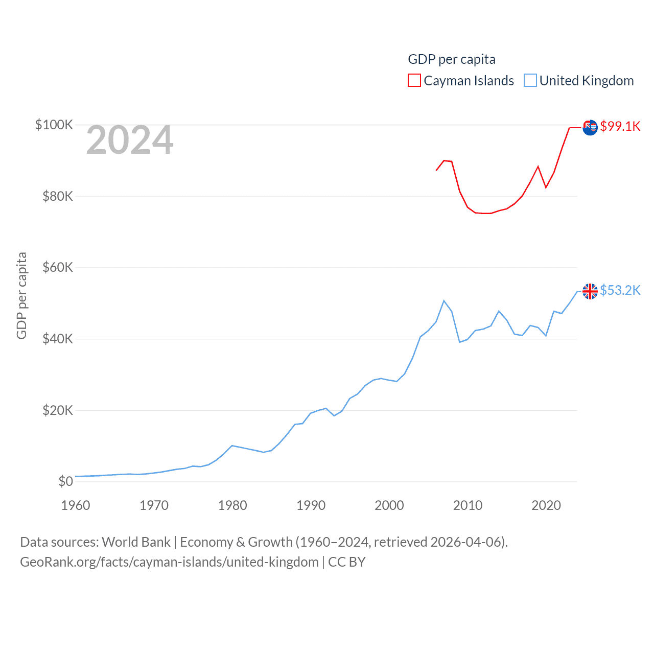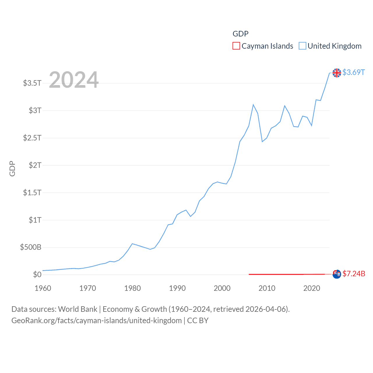 By GDP, The Cayman Islands ranks 158/197 ($7.24B) and The United Kingdom ranks 6/197 ($3.69T). By GDP per capita, The Cayman Islands ranks 6/197 ($99,144), while The United Kingdom ranks 22/197 ($53,246).