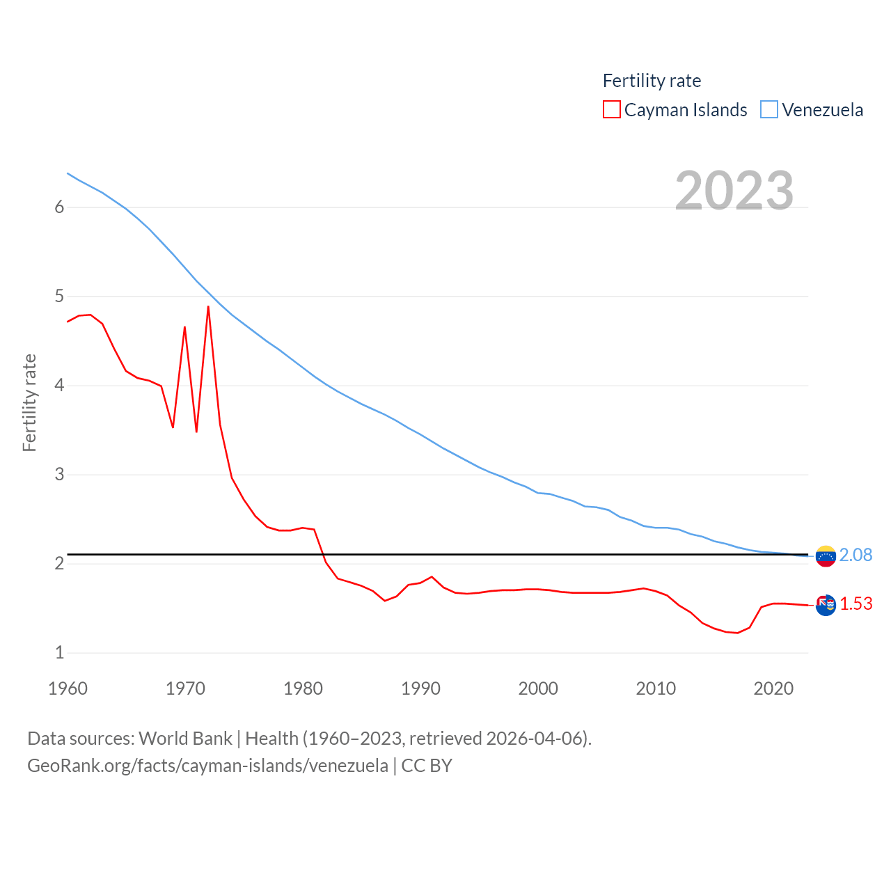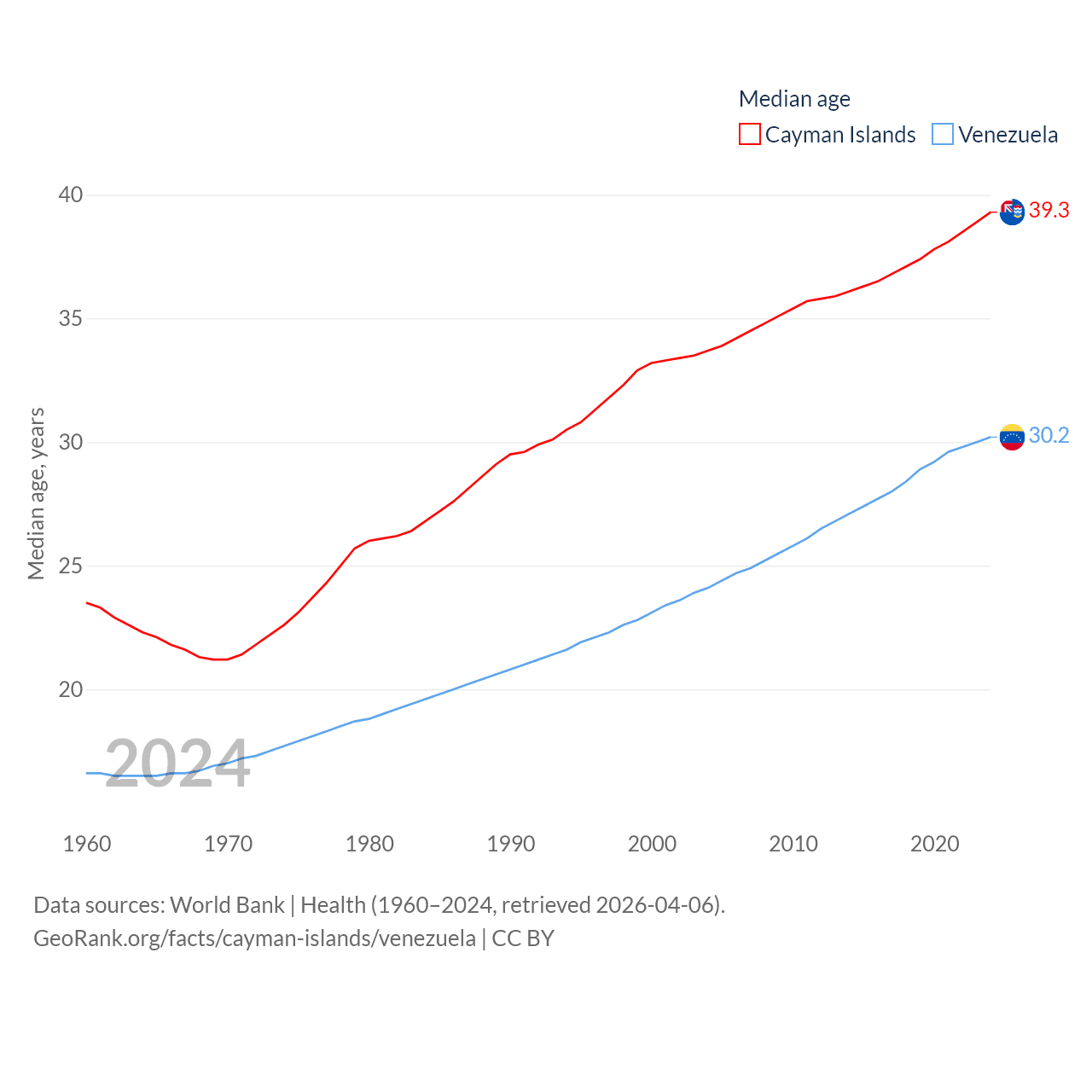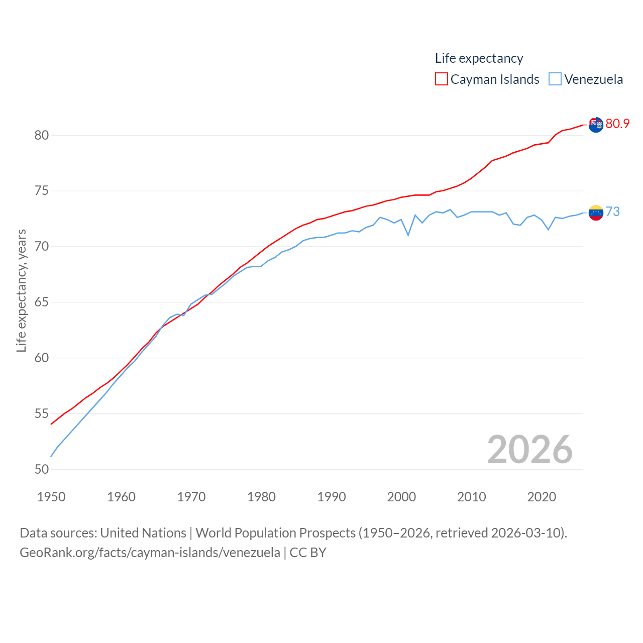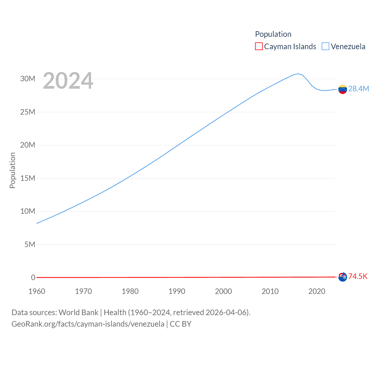 The Cayman Islands has a population of 74.5K (ranked 187/197), compared with 28.4M in Venezuela (ranked 53/197). The Cayman Islands' land area is 92.7 sq mi versus 340,561 sq mi for Venezuela (ranked 190th vs. 32nd).