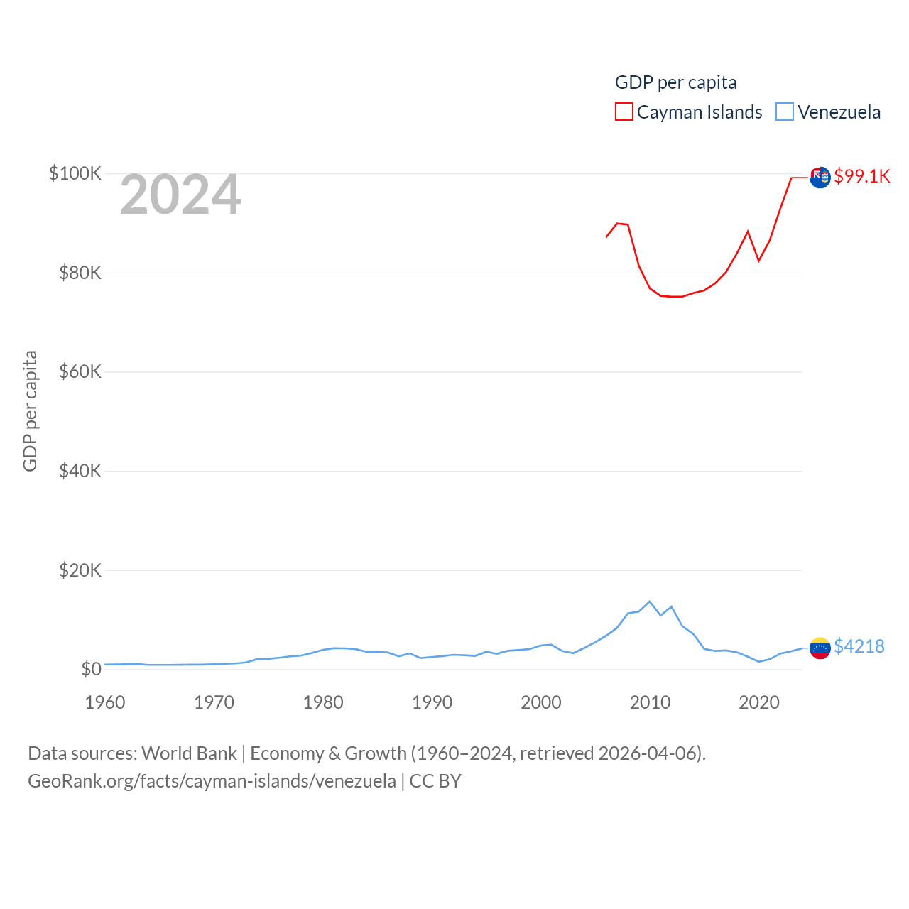 By GDP, The Cayman Islands ranks 158/197 ($7.24B) and Venezuela ranks 65/197 ($120B). By GDP per capita, The Cayman Islands ranks 6/197 ($99,144), while Venezuela ranks 128/197 ($4,218).