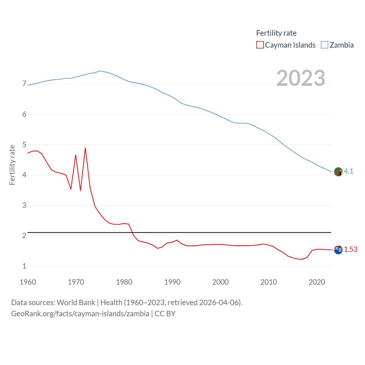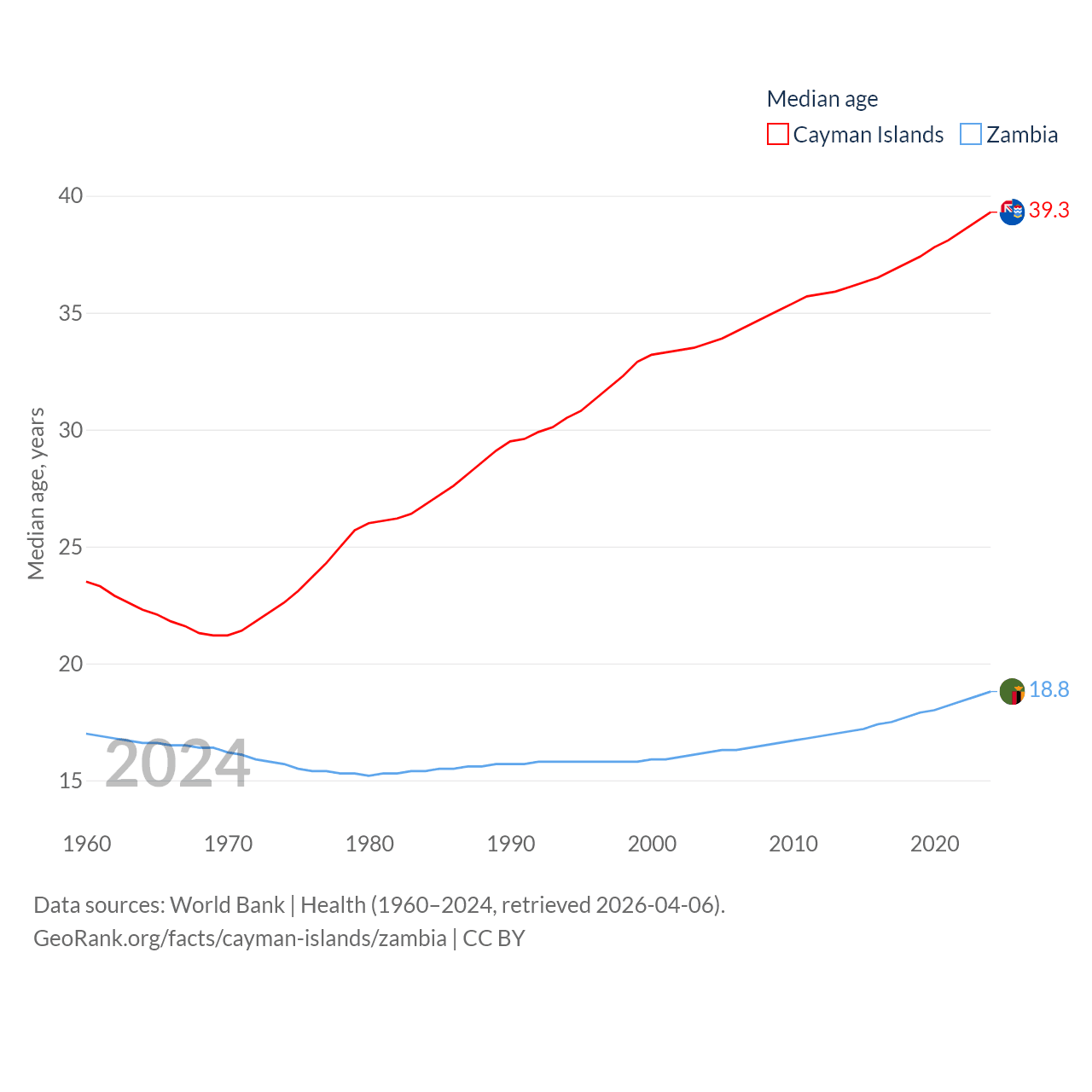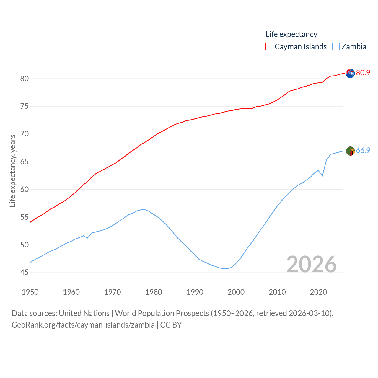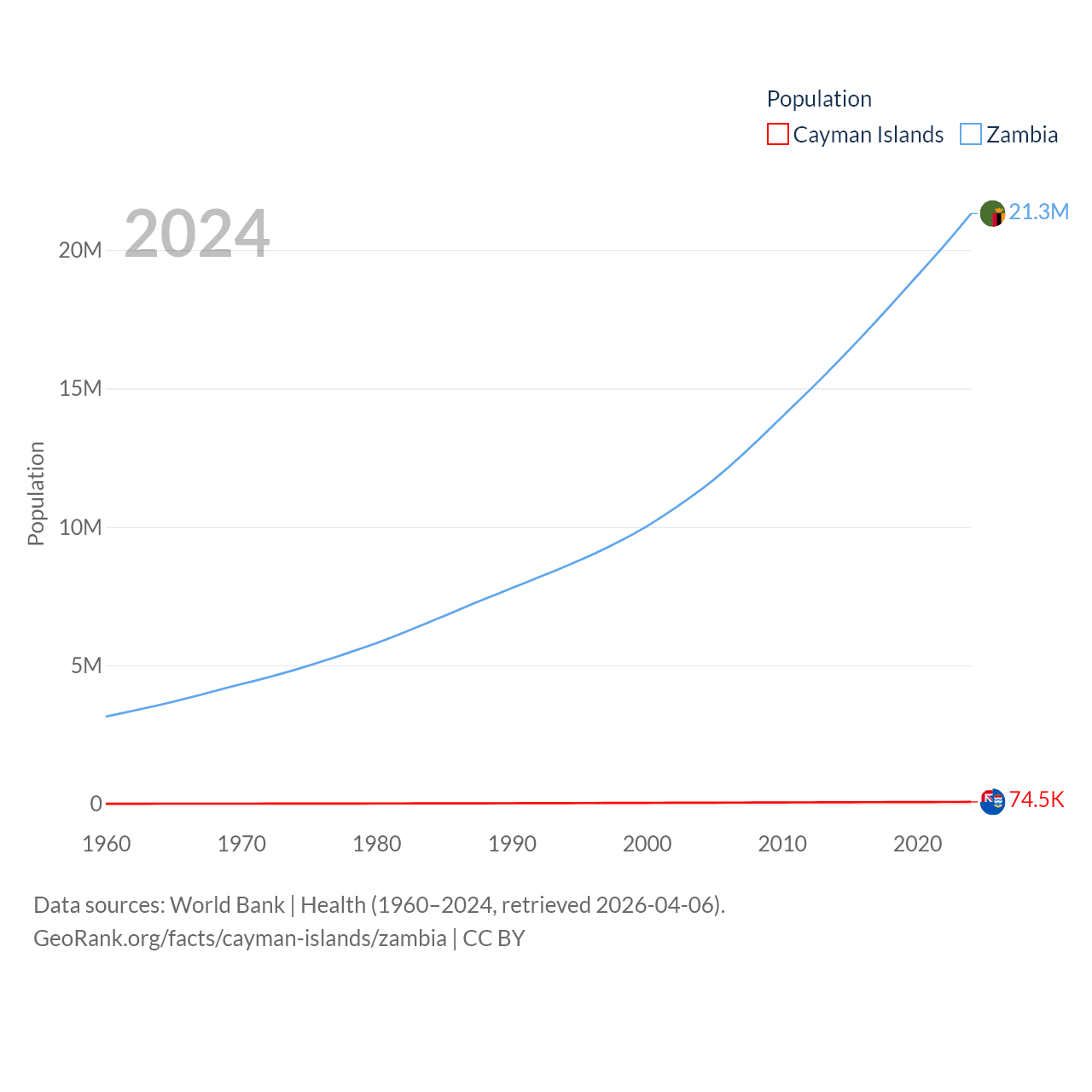 The Cayman Islands has a population of 74.5K (ranked 187/197), compared with 21.3M in Zambia (ranked 63/197). The Cayman Islands' land area is 92.7 sq mi versus 287,024 sq mi for Zambia (ranked 190th vs. 37th).