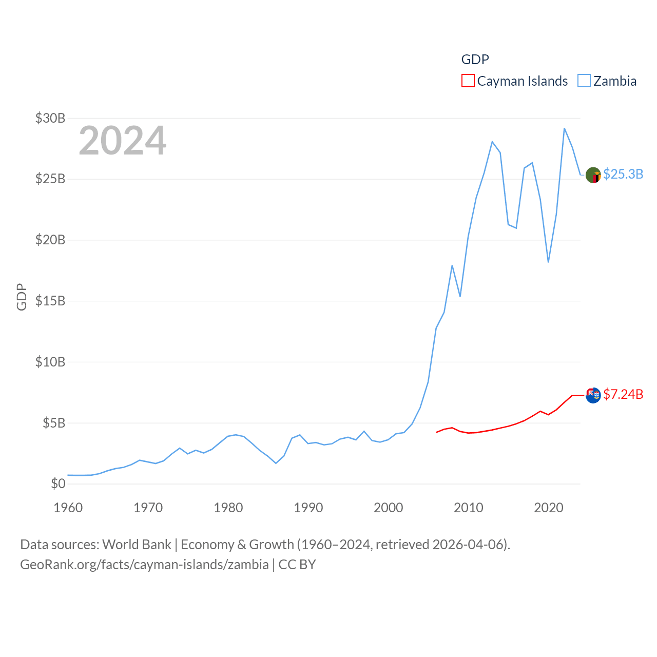 By GDP, The Cayman Islands ranks 158/197 ($7.24B) and Zambia ranks 116/197 ($25.3B). By GDP per capita, The Cayman Islands ranks 6/197 ($99,144), while Zambia ranks 169/197 ($1,187).