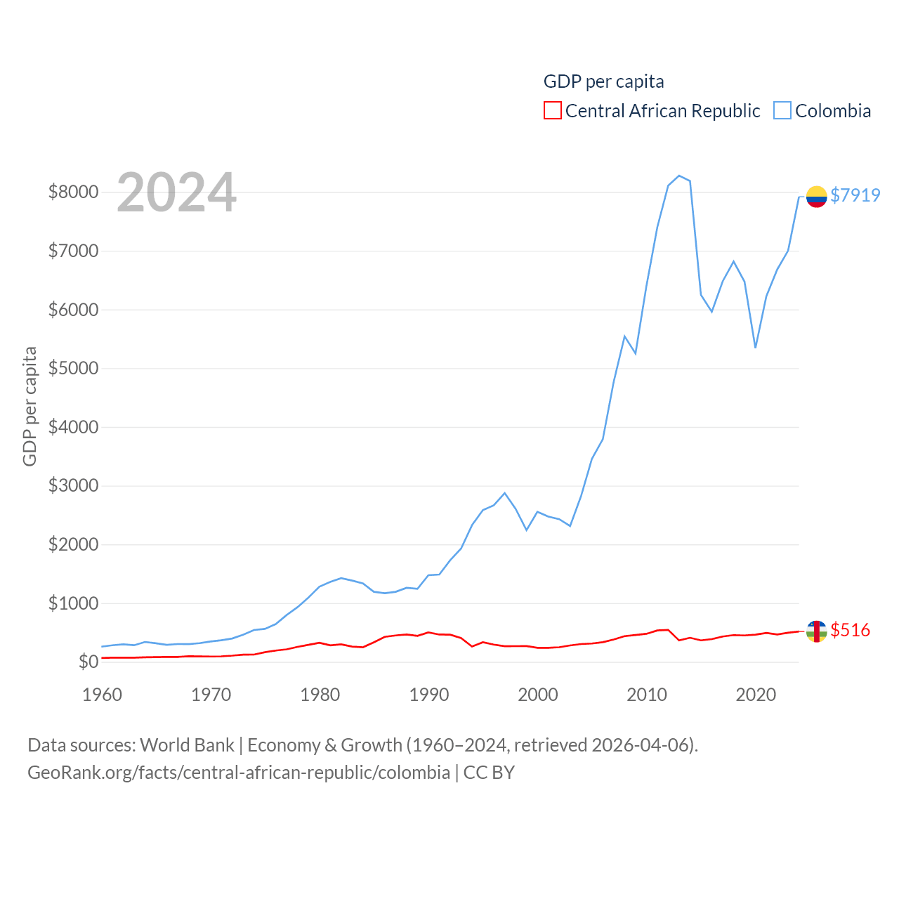 By GDP, The Central African Republic ranks 171/197 ($2.75B) and Colombia ranks 39/197 ($419B). By GDP per capita, The Central African Republic ranks 195/197 ($516), while Colombia ranks 94/197 ($7,919).