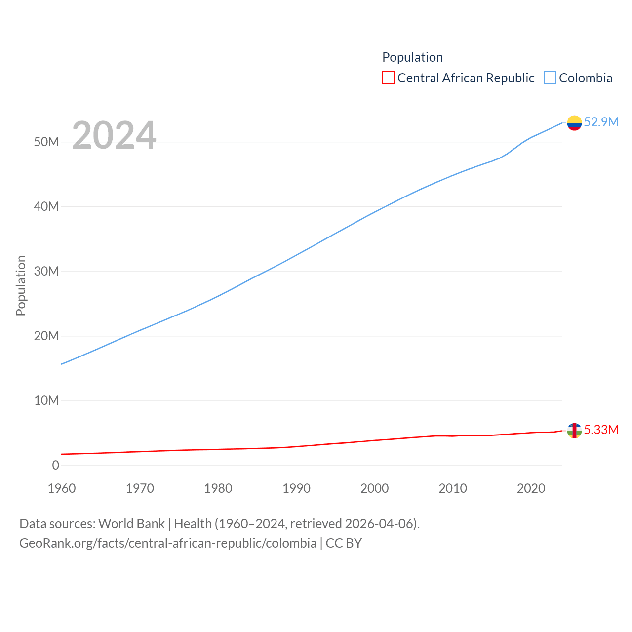 The Central African Republic has a population of 5.33M (ranked 121/197), compared with 52.9M in Colombia (ranked 28/197). The Central African Republic's land area is 240,534 sq mi versus 428,380 sq mi for Colombia (ranked 43rd vs. 26th).