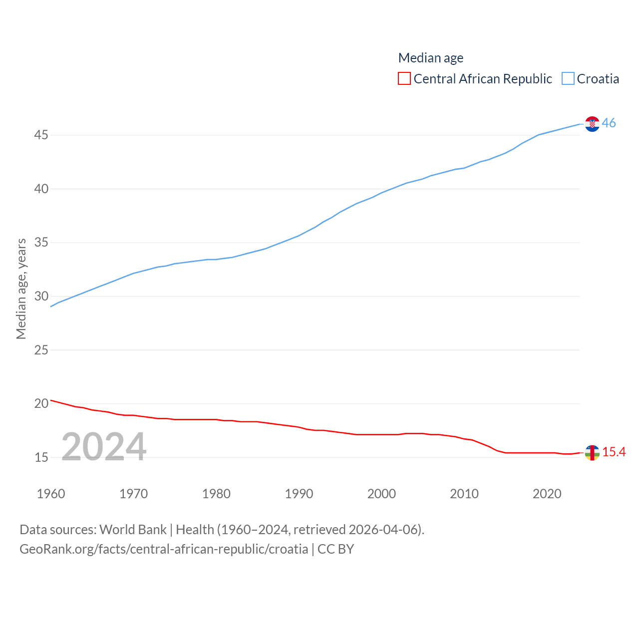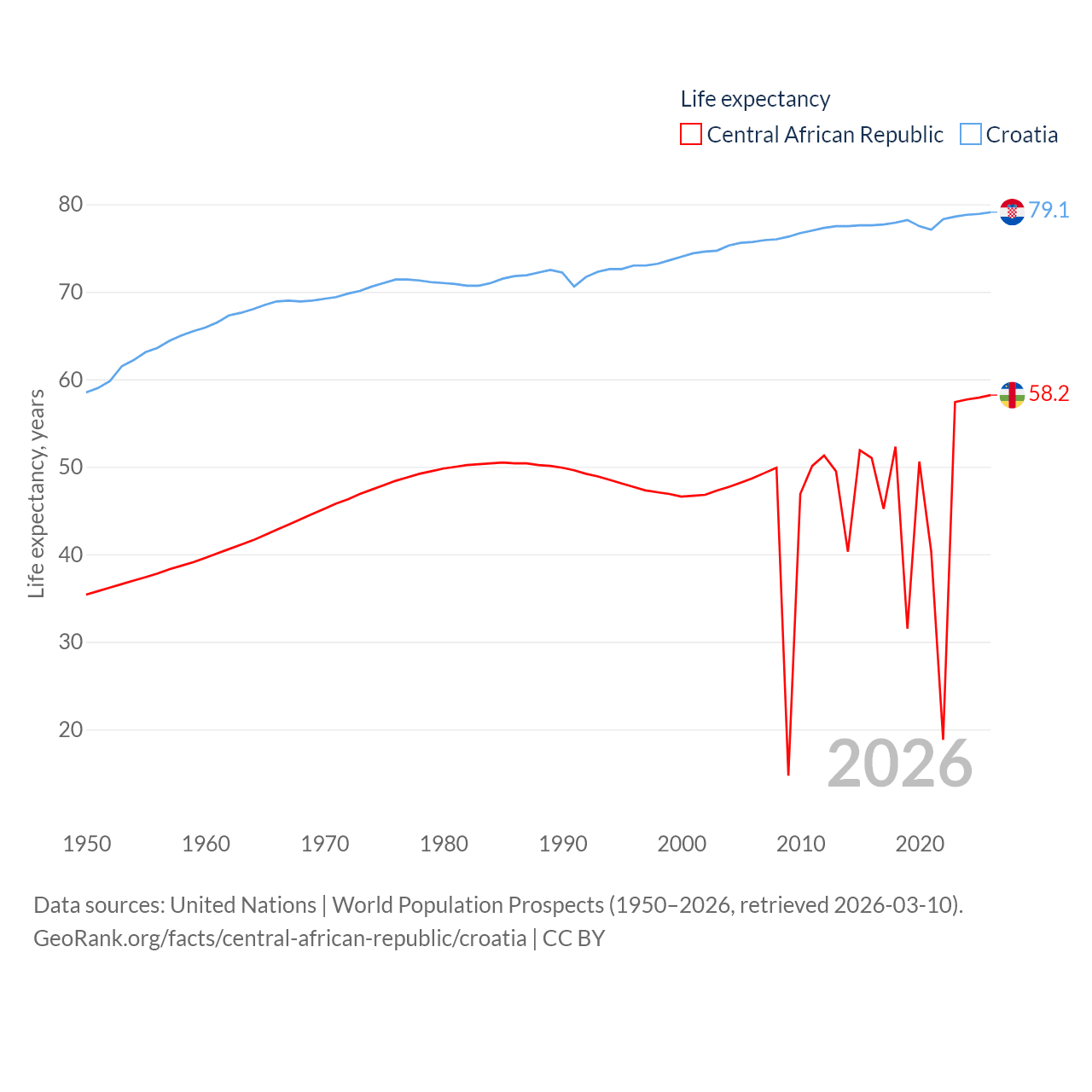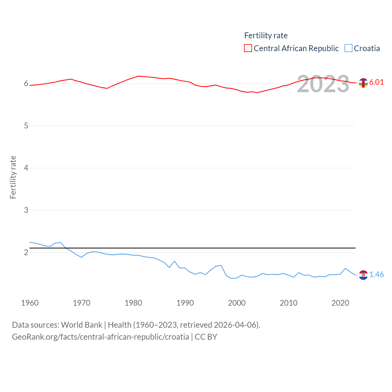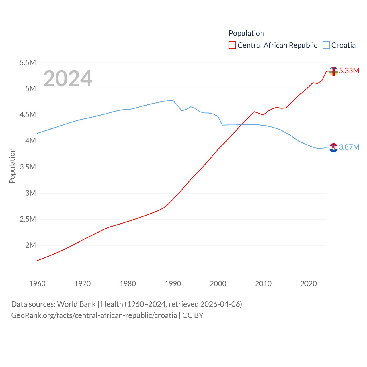 The Central African Republic has a population of 5.33M (ranked 121/197), compared with 3.87M in Croatia (ranked 129/197). The Central African Republic's land area is 240,534 sq mi versus 21,606 sq mi for Croatia (ranked 43rd vs. 123rd).
