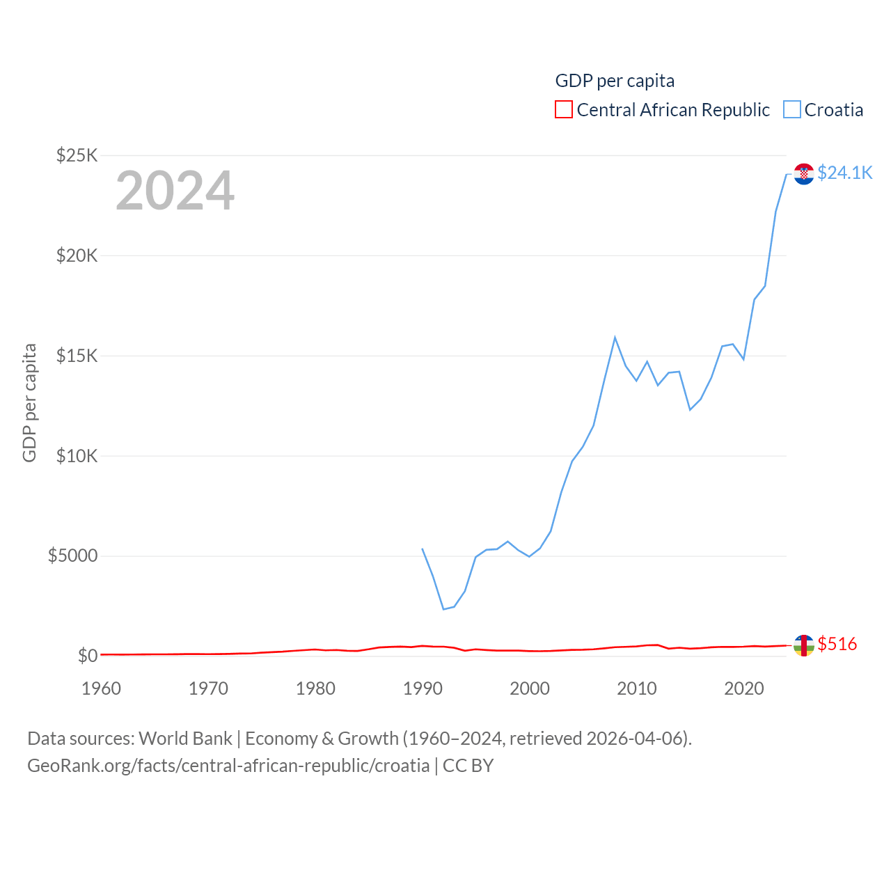By GDP, The Central African Republic ranks 171/197 ($2.75B) and Croatia ranks 75/197 ($93B). By GDP per capita, The Central African Republic ranks 195/197 ($516), while Croatia ranks 50/197 ($24,050).