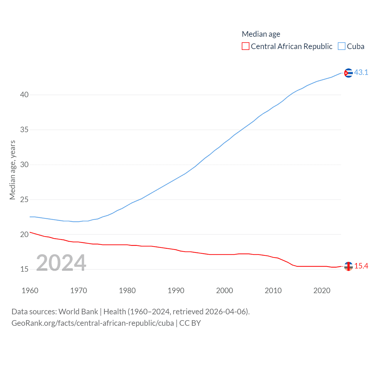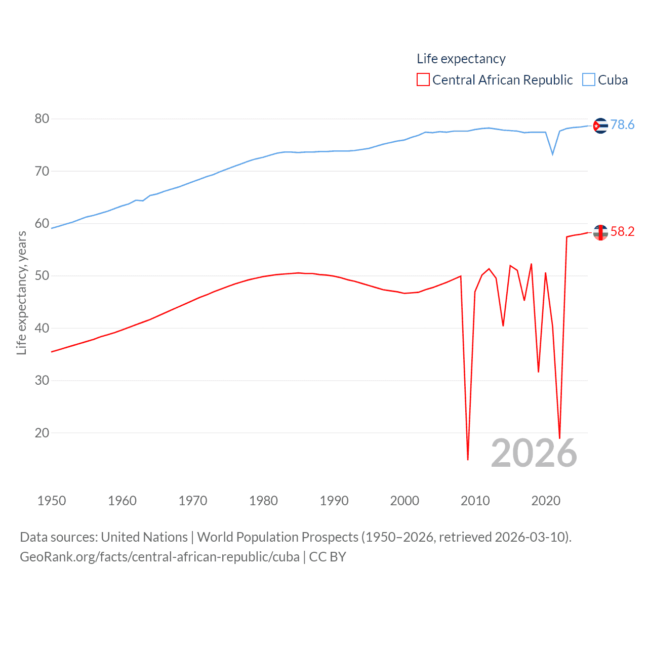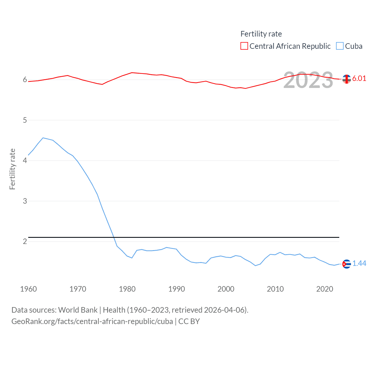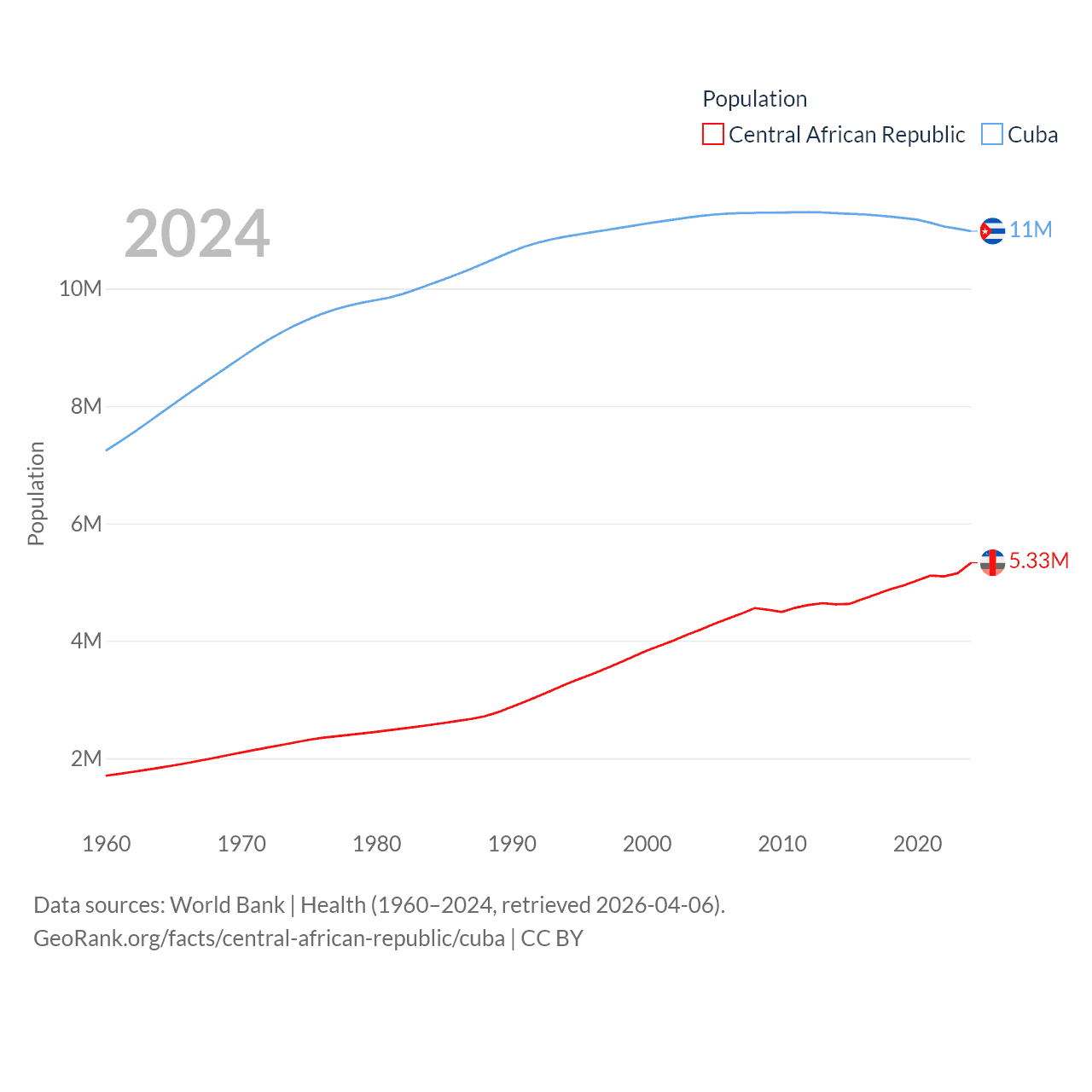 The Central African Republic has a population of 5.33M (ranked 121/197), compared with 11M in Cuba (ranked 87/197). The Central African Republic's land area is 240,534 sq mi versus 40,077 sq mi for Cuba (ranked 43rd vs. 103rd).