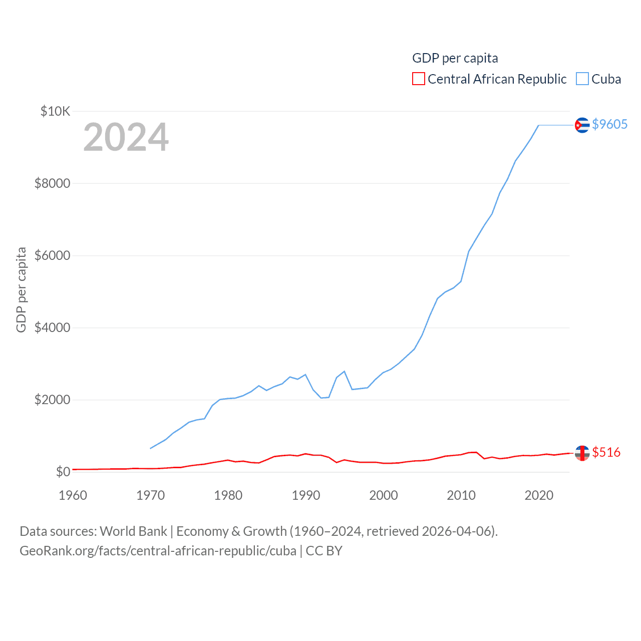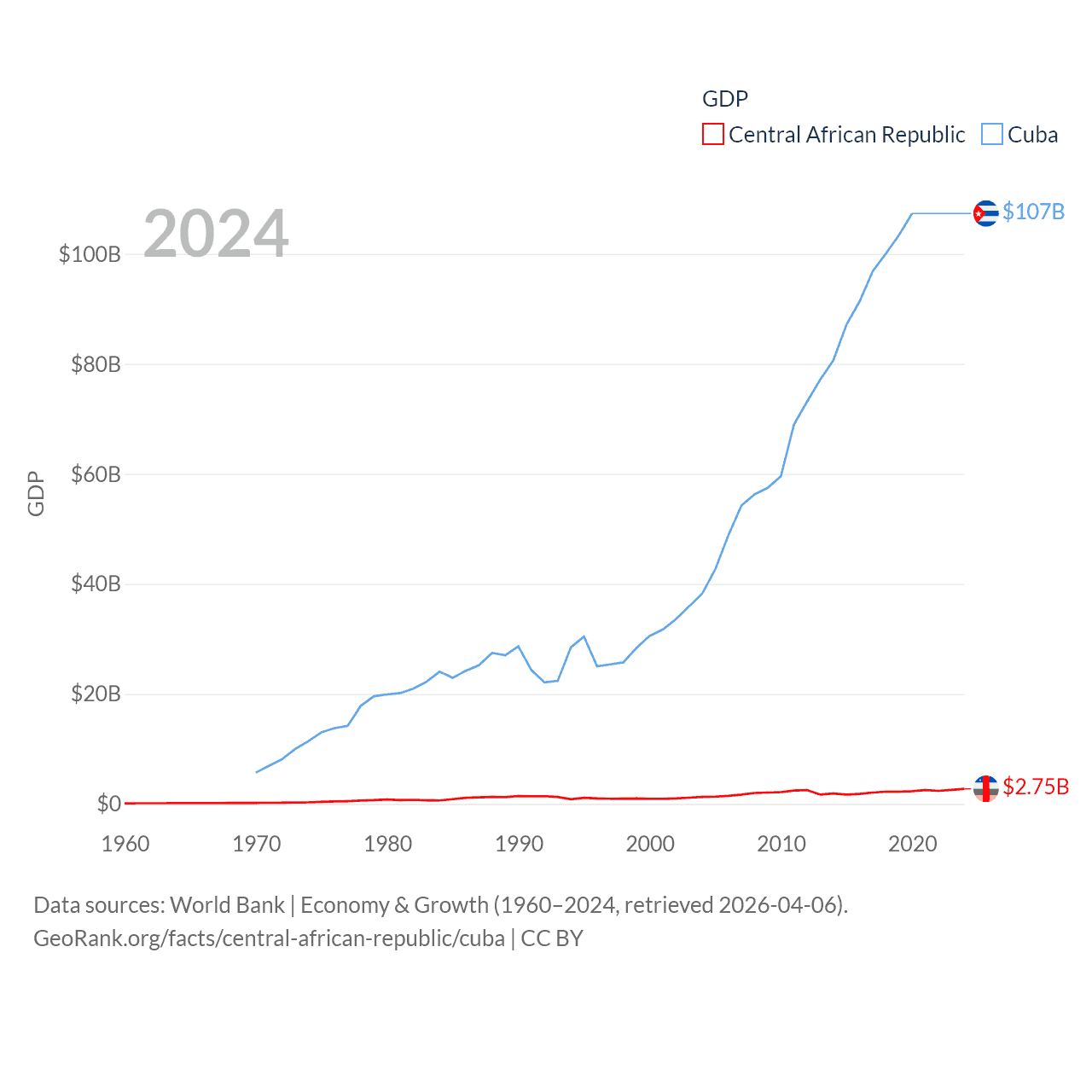 By GDP, The Central African Republic ranks 171/197 ($2.75B) and Cuba ranks 69/197 ($107B). By GDP per capita, The Central African Republic ranks 195/197 ($516), while Cuba ranks 86/197 ($9,605).
