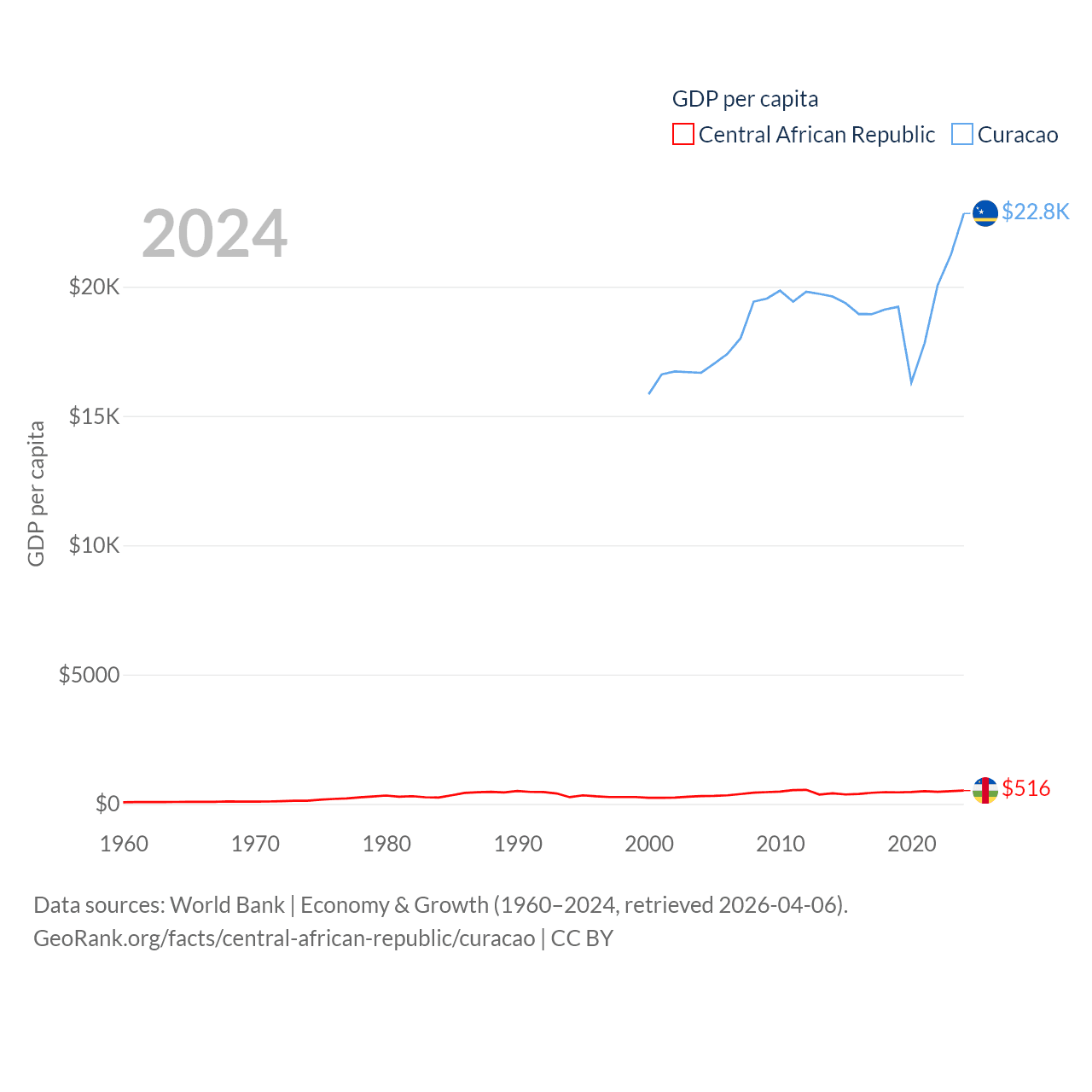 By GDP, The Central African Republic ranks 171/197 ($2.75B) and Curacao ranks 167/197 ($3.56B). By GDP per capita, The Central African Republic ranks 195/197 ($516), while Curacao ranks 56/197 ($22,833).