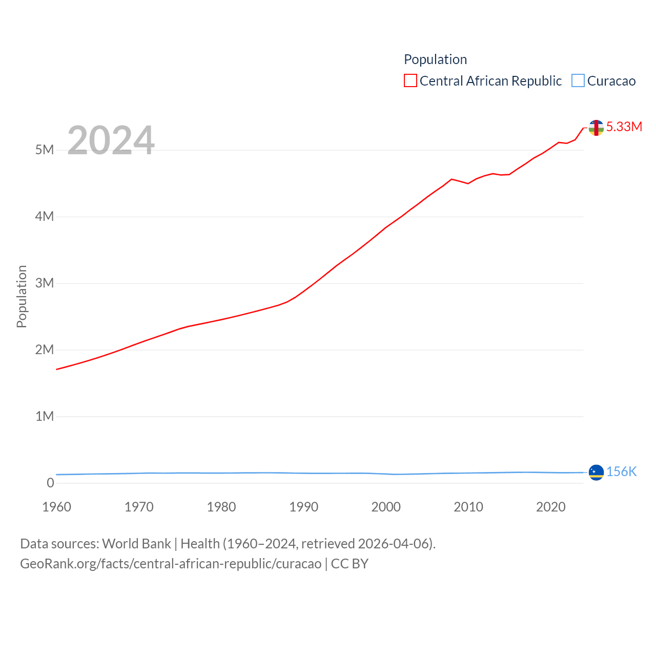 The Central African Republic has a population of 5.33M (ranked 121/197), compared with 156K in Curacao (ranked 179/197). The Central African Republic's land area is 240,534 sq mi versus 171.4 sq mi for Curacao (ranked 43rd vs. 182nd).