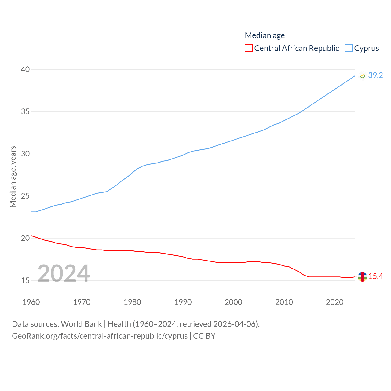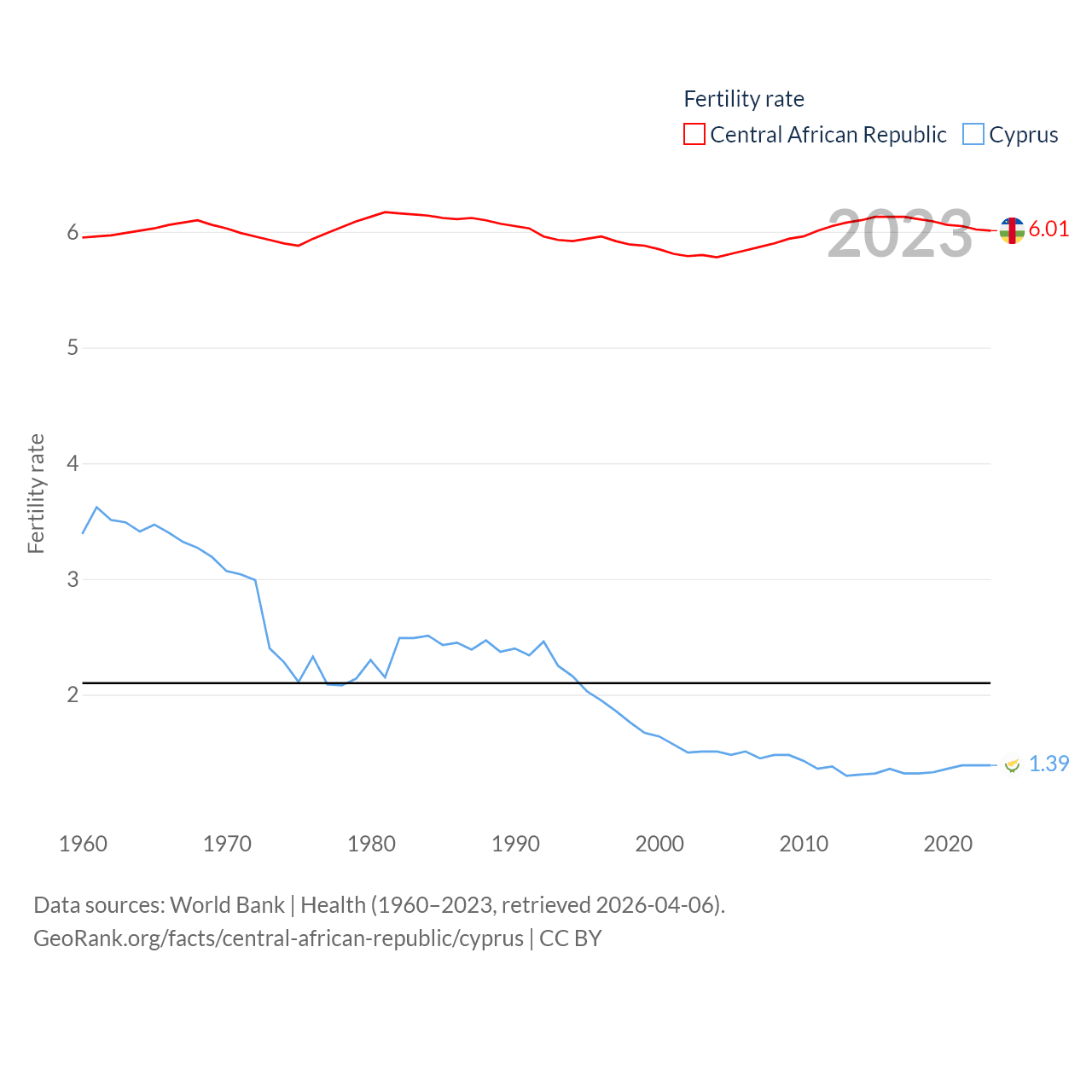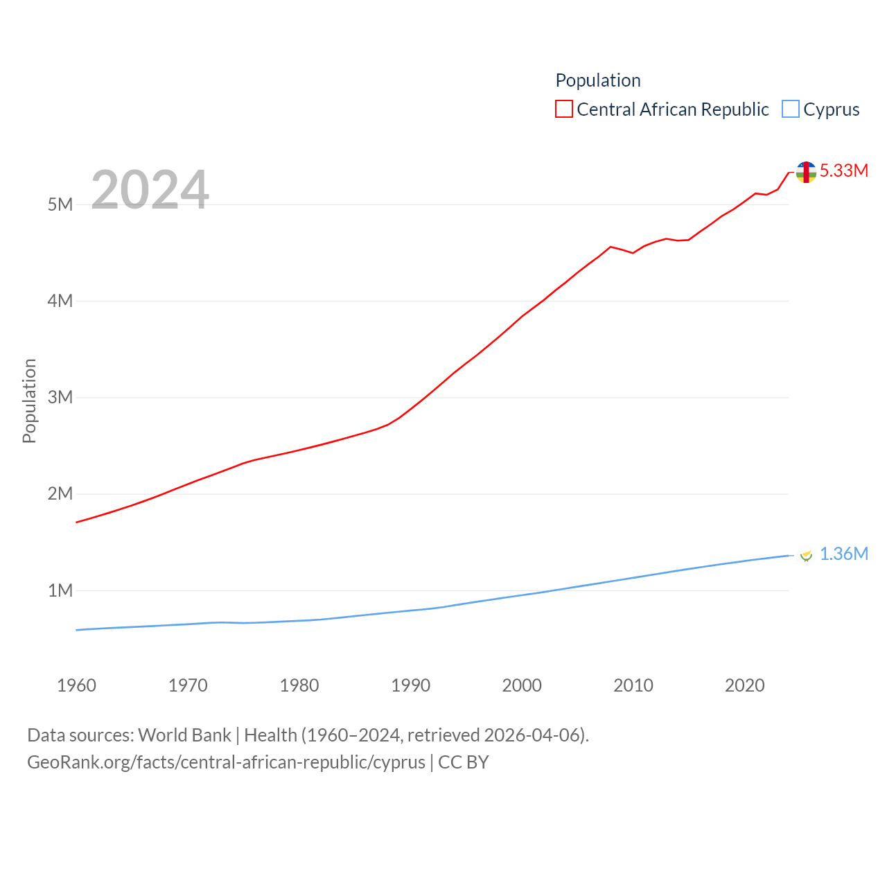 The Central African Republic has a population of 5.33M (ranked 121/197), compared with 1.36M in Cyprus (ranked 155/197). The Central African Republic's land area is 240,534 sq mi versus 3,568 sq mi for Cyprus (ranked 43rd vs. 163rd).