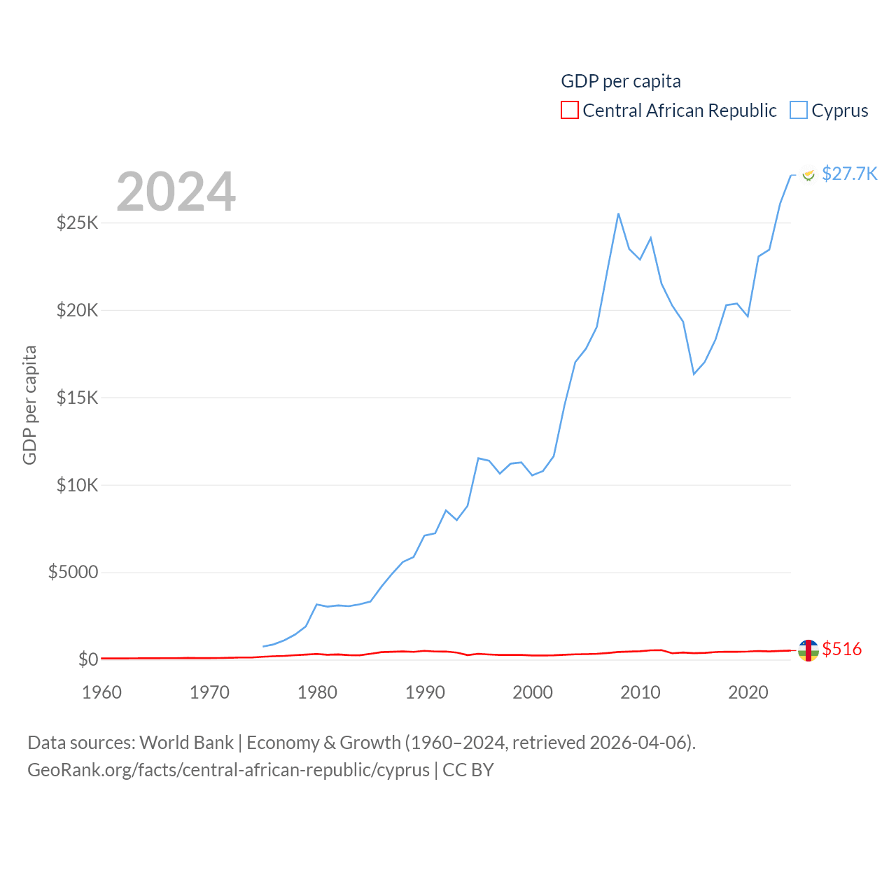 By GDP, The Central African Republic ranks 171/197 ($2.75B) and Cyprus ranks 103/197 ($37.6B). By GDP per capita, The Central African Republic ranks 195/197 ($516), while Cyprus ranks 45/197 ($27,707).