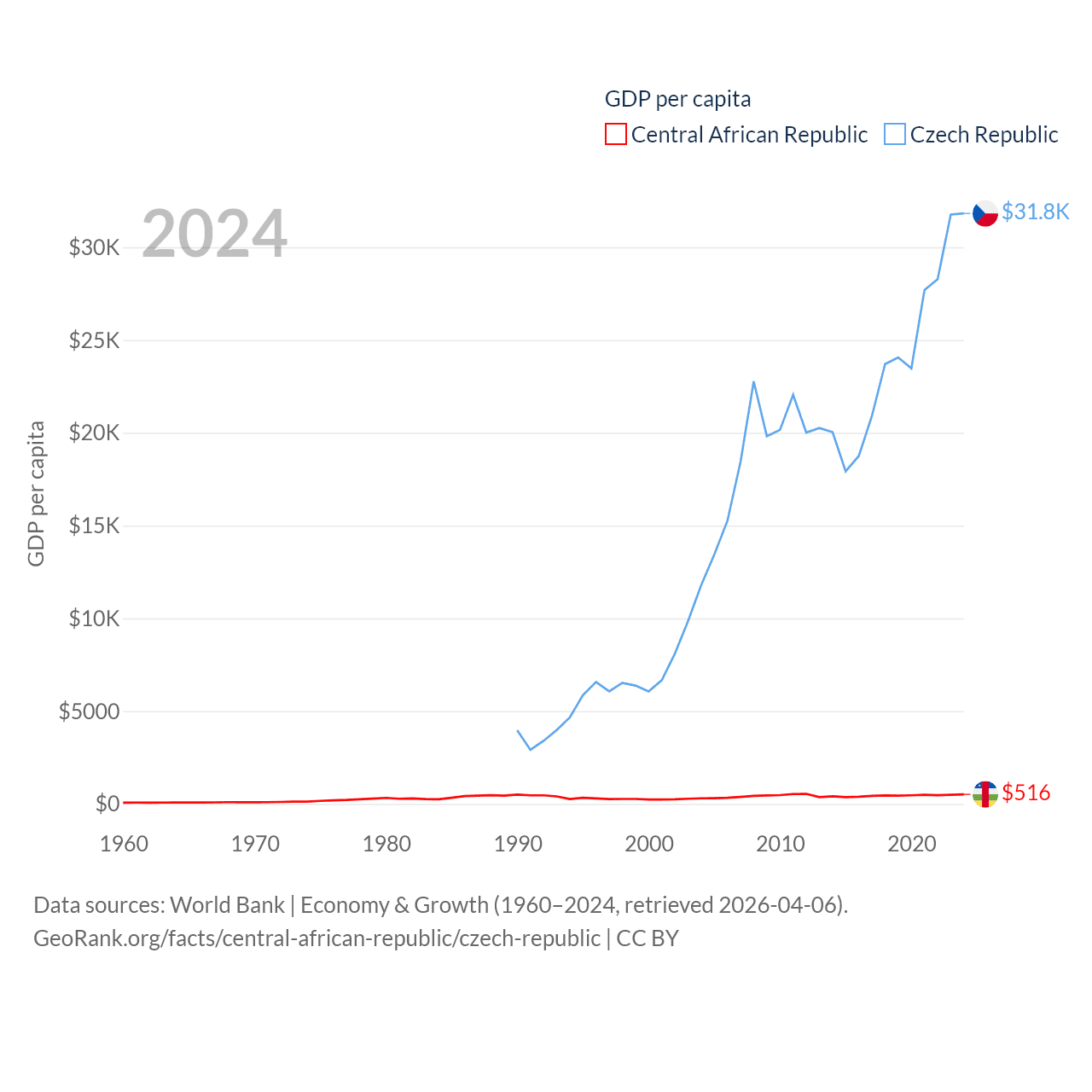 By GDP, The Central African Republic ranks 171/197 ($2.75B) and The Czech Republic ranks 44/197 ($347B). By GDP per capita, The Central African Republic ranks 195/197 ($516), while The Czech Republic ranks 39/197 ($31,823).