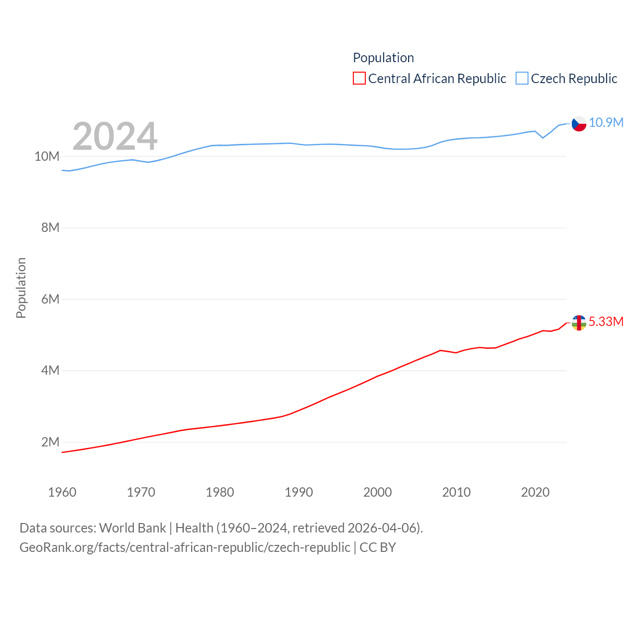 The Central African Republic has a population of 5.33M (ranked 121/197), compared with 10.9M in The Czech Republic (ranked 88/197). The Central African Republic's land area is 240,534 sq mi versus 29,794 sq mi for The Czech Republic (ranked 43rd vs. 114th).