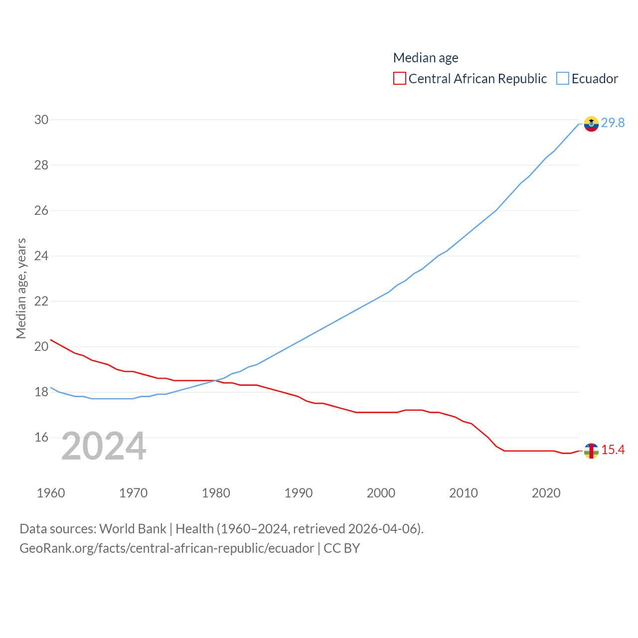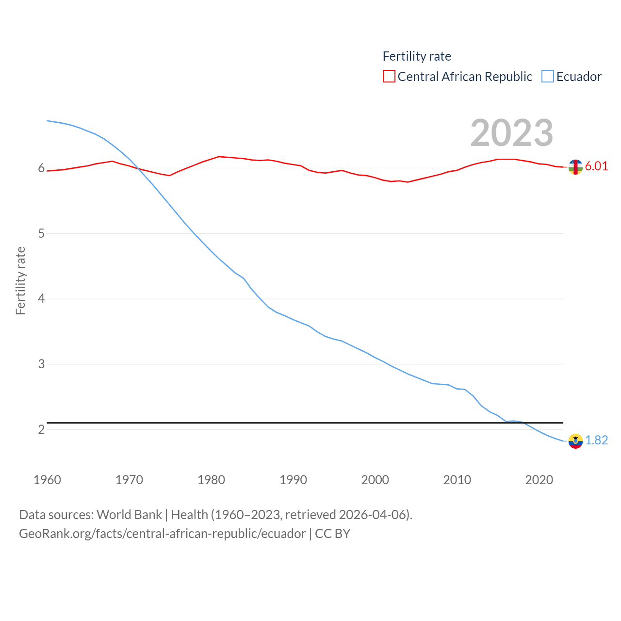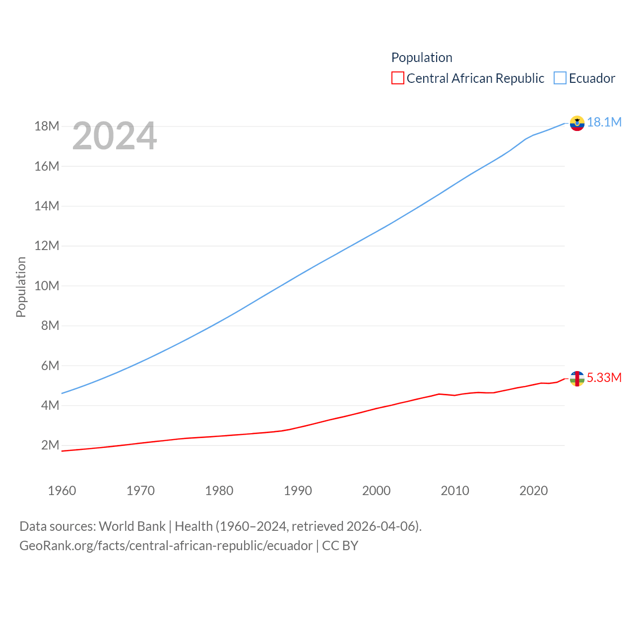 The Central African Republic has a population of 5.33M (ranked 121/197), compared with 18.1M in Ecuador (ranked 71/197). The Central African Republic's land area is 240,534 sq mi versus 95,892 sq mi for Ecuador (ranked 43rd vs. 76th).