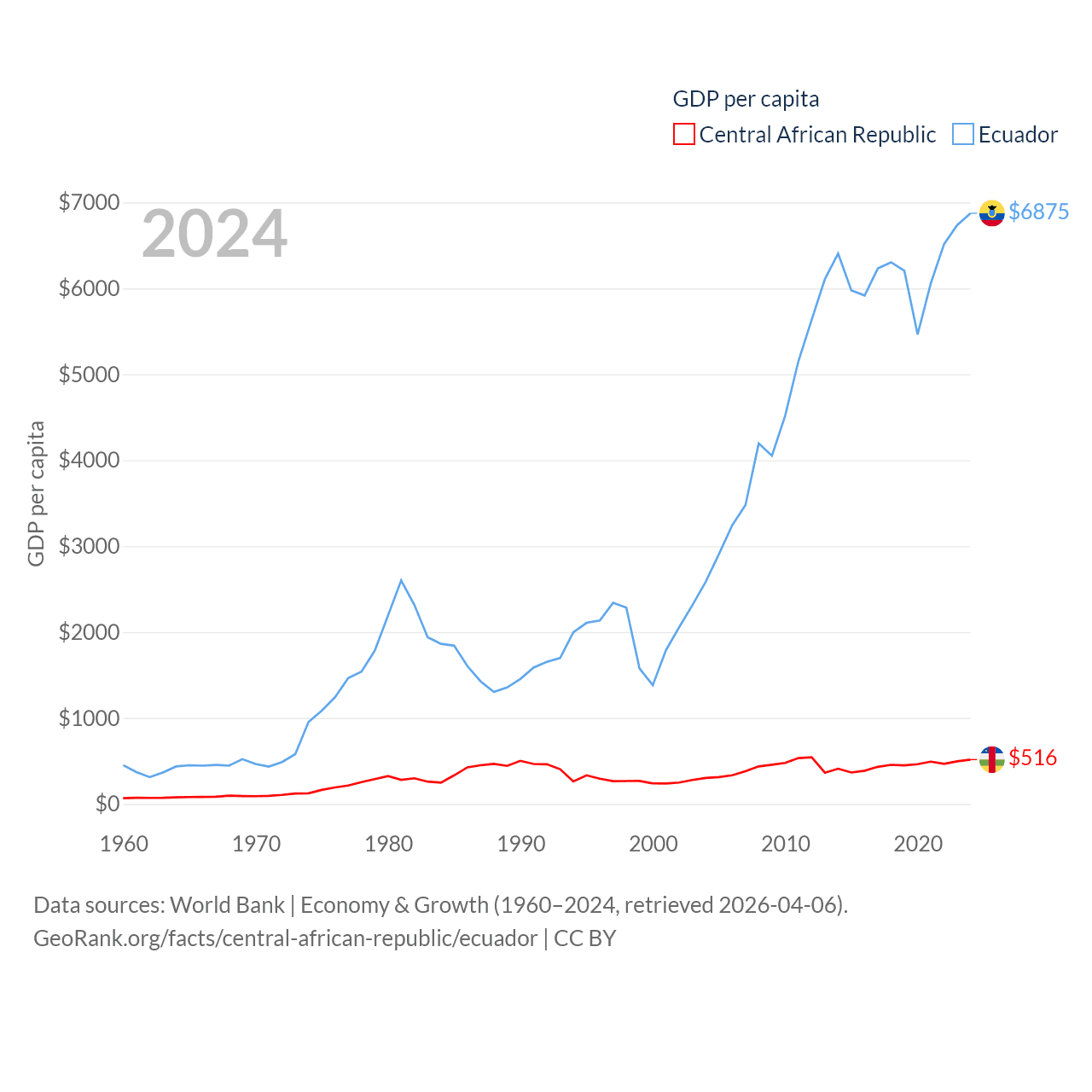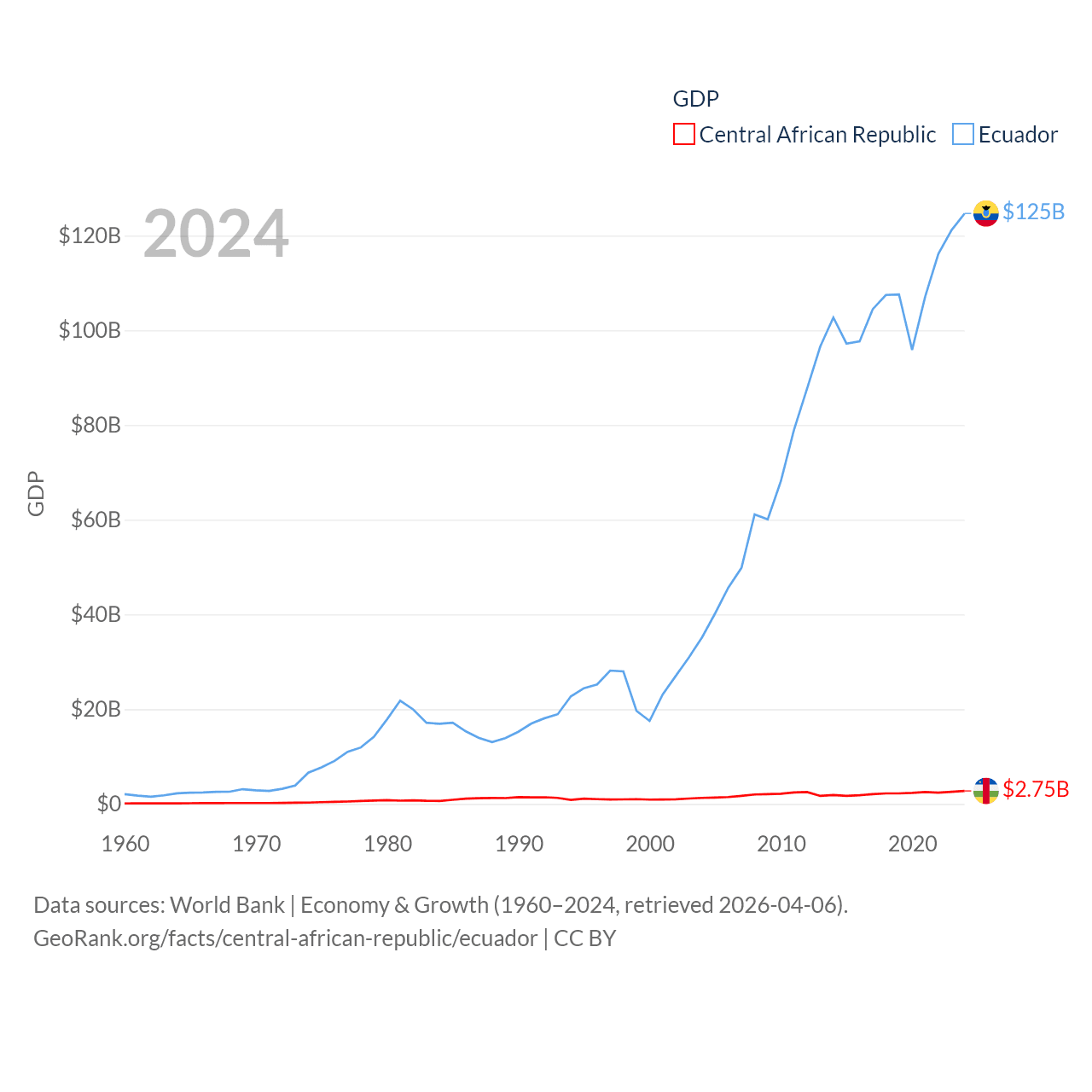 By GDP, The Central African Republic ranks 171/197 ($2.75B) and Ecuador ranks 62/197 ($125B). By GDP per capita, The Central African Republic ranks 195/197 ($516), while Ecuador ranks 103/197 ($6,875).