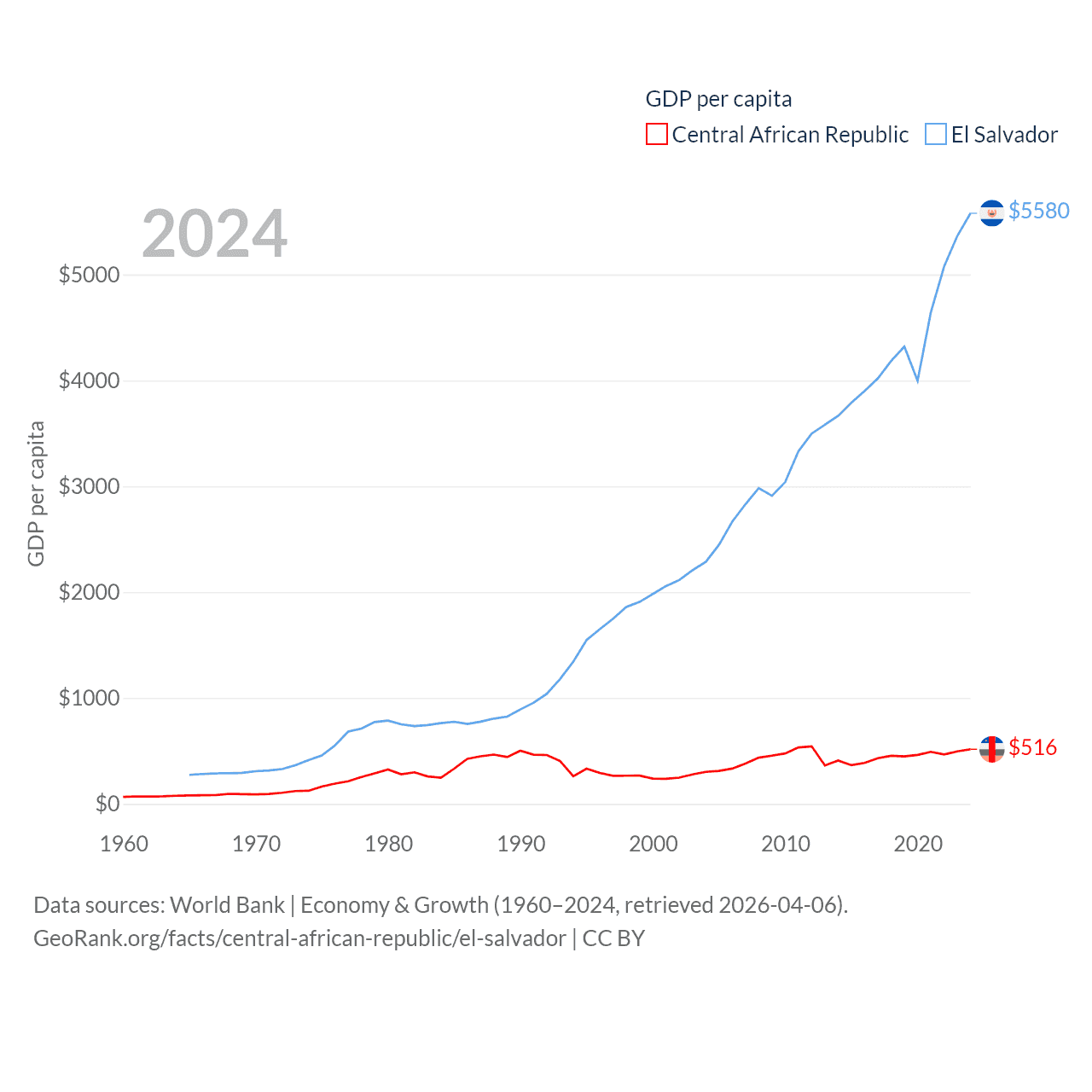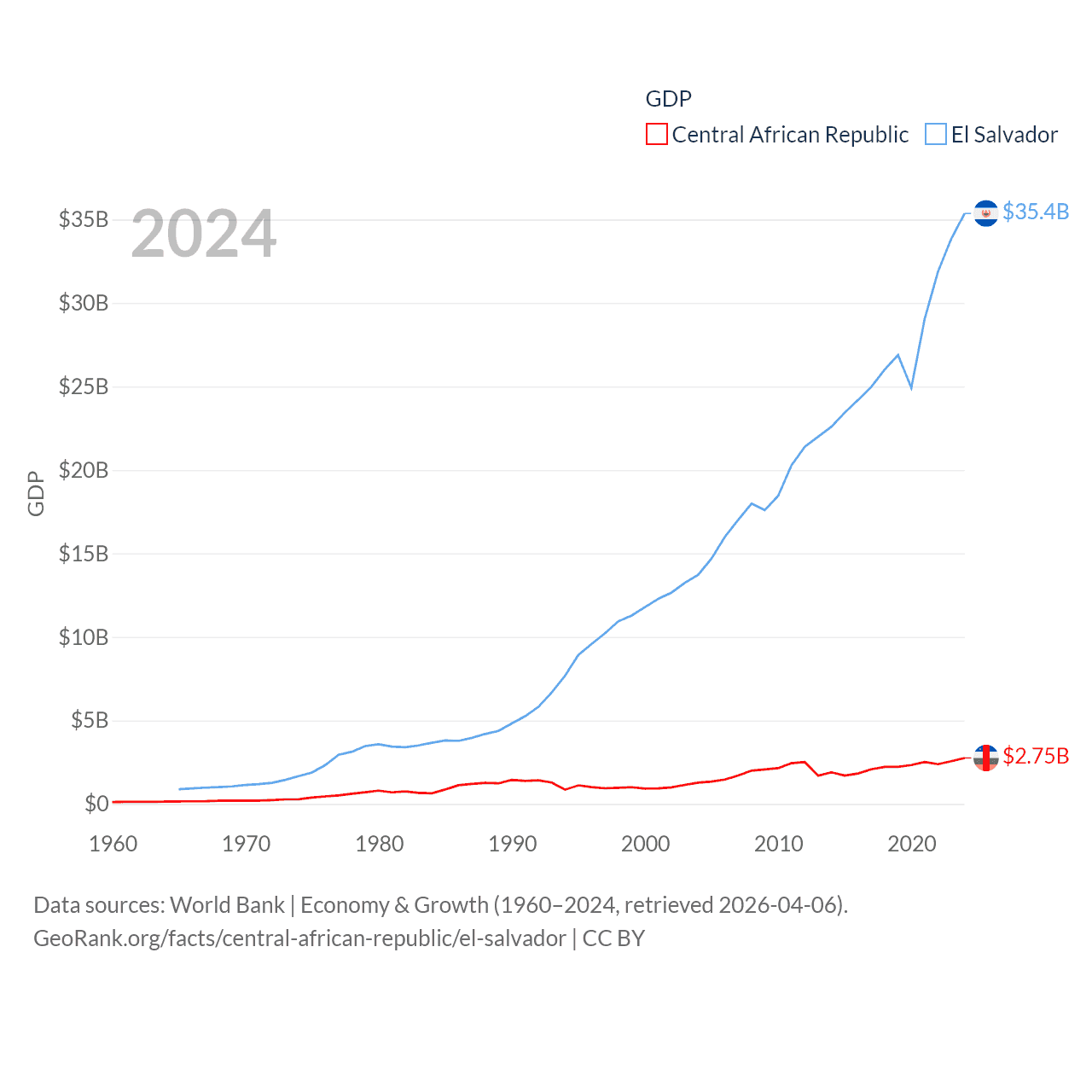 By GDP, The Central African Republic ranks 171/197 ($2.75B) and El Salvador ranks 105/197 ($35.4B). By GDP per capita, The Central African Republic ranks 195/197 ($516), while El Salvador ranks 116/197 ($5,580).