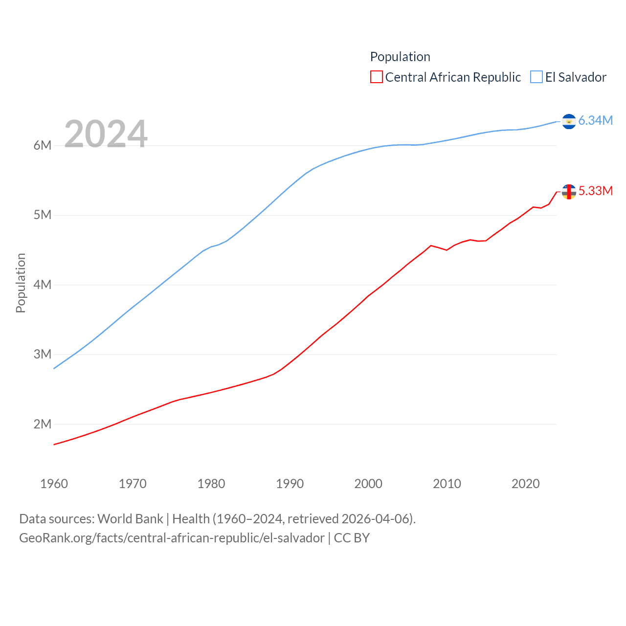 The Central African Republic has a population of 5.33M (ranked 121/197), compared with 6.34M in El Salvador (ranked 111/197). The Central African Republic's land area is 240,534 sq mi versus 8,000 sq mi for El Salvador (ranked 43rd vs. 150th).