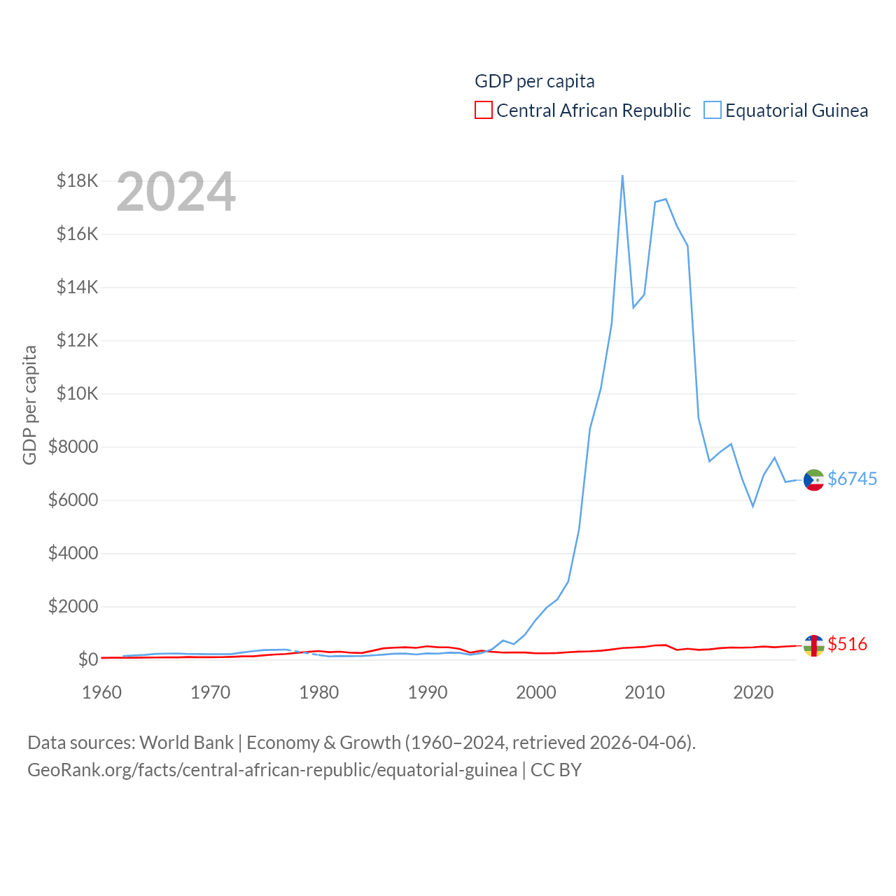 By GDP, The Central African Republic ranks 171/197 ($2.75B) and Equatorial Guinea ranks 148/197 ($12.8B). By GDP per capita, The Central African Republic ranks 195/197 ($516), while Equatorial Guinea ranks 106/197 ($6,745).