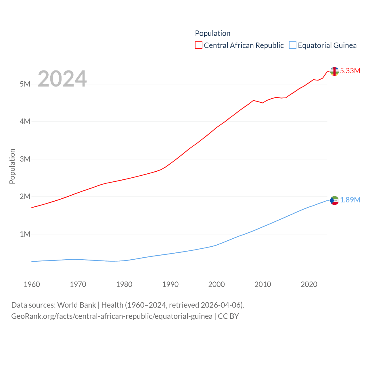 The Central African Republic has a population of 5.33M (ranked 121/197), compared with 1.89M in Equatorial Guinea (ranked 148/197). The Central African Republic's land area is 240,534 sq mi versus 10,830 sq mi for Equatorial Guinea (ranked 43rd vs. 140th).