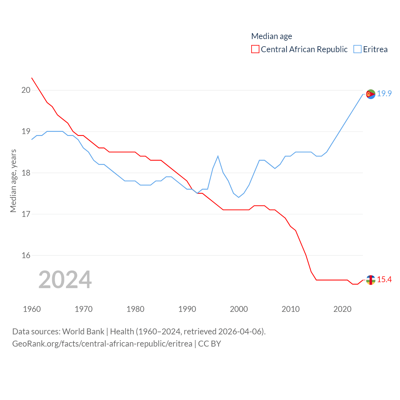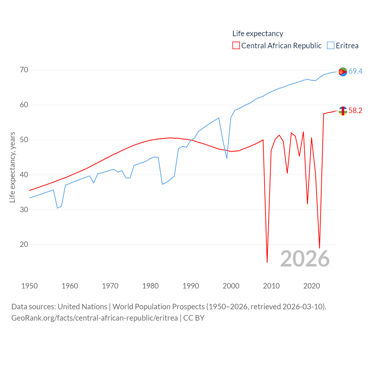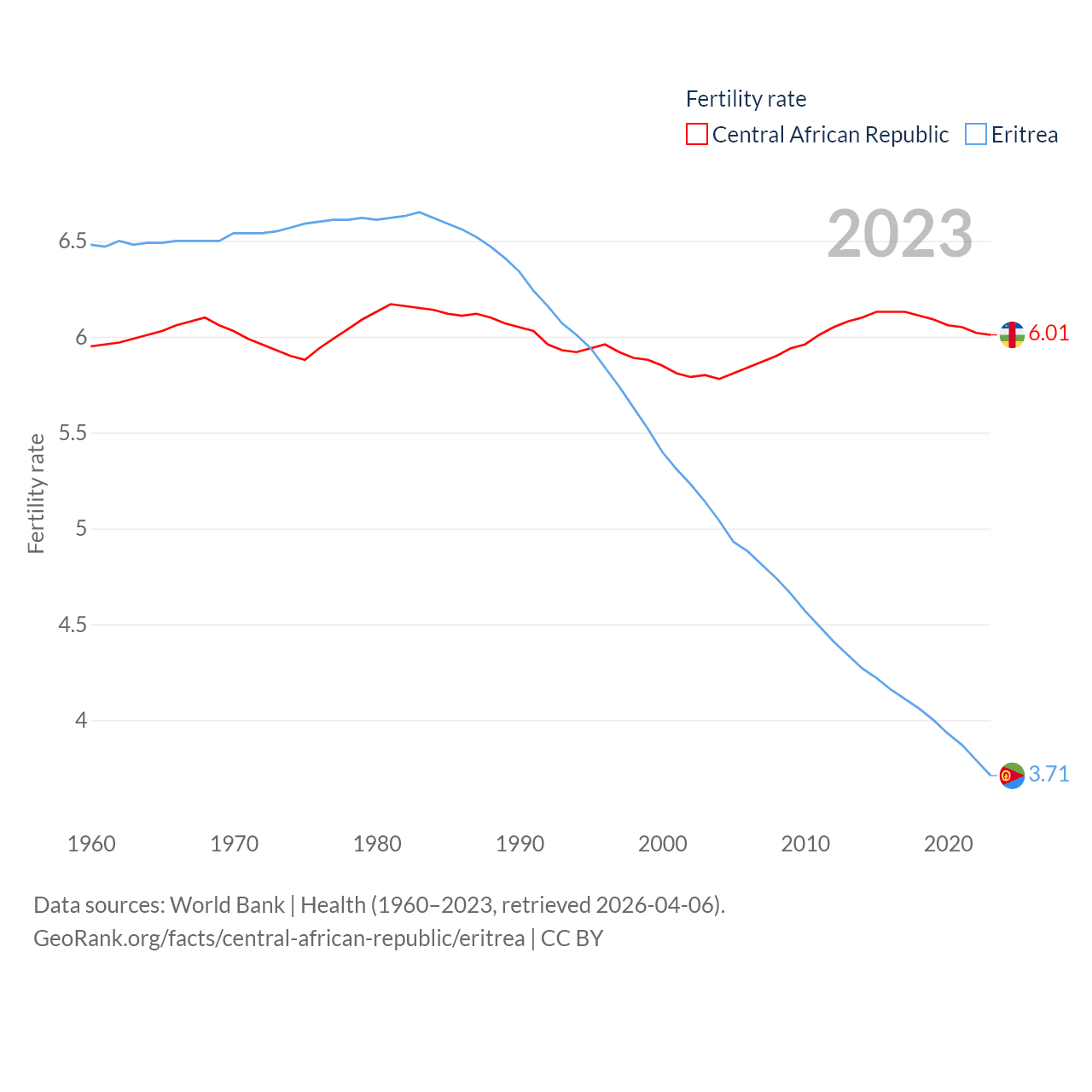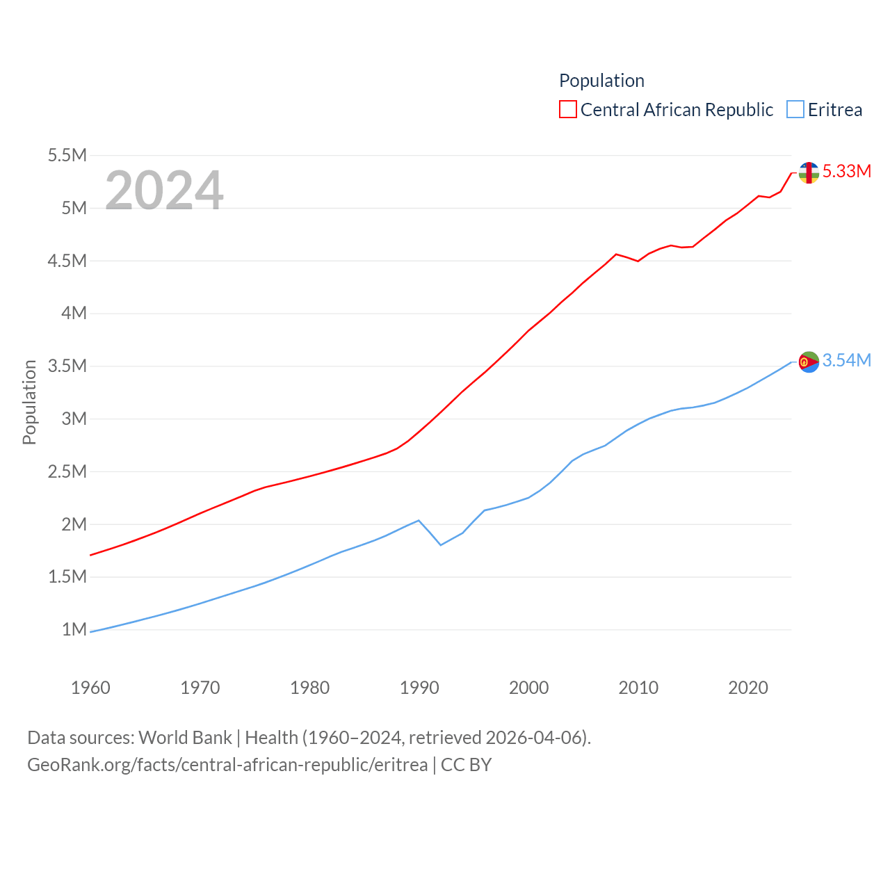 The Central African Republic has a population of 5.33M (ranked 121/197), compared with 3.54M in Eritrea (ranked 131/197). The Central African Republic's land area is 240,534 sq mi versus 46,787 sq mi for Eritrea (ranked 43rd vs. 96th).