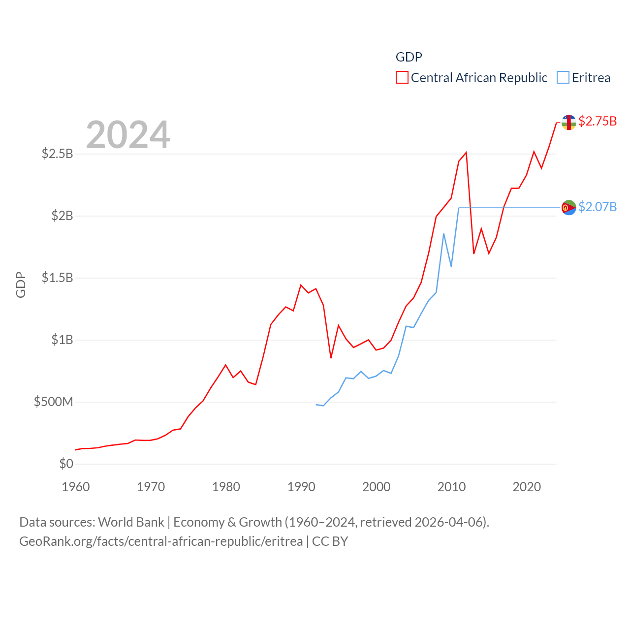 By GDP, The Central African Republic ranks 171/197 ($2.75B) and Eritrea ranks 179/197 ($2.07B). By GDP per capita, The Central African Republic ranks 195/197 ($516), while Eritrea ranks 188/197 ($689).