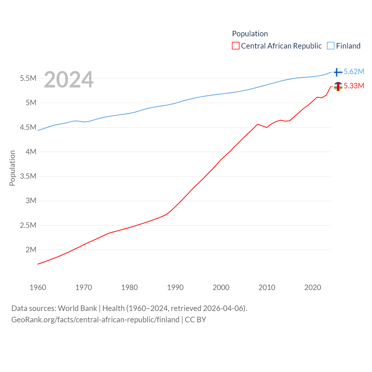 The Central African Republic has a population of 5.33M (ranked 121/197), compared with 5.62M in Finland (ranked 116/197). The Central African Republic's land area is 240,534 sq mi versus 117,360 sq mi for Finland (ranked 43rd vs. 70th).