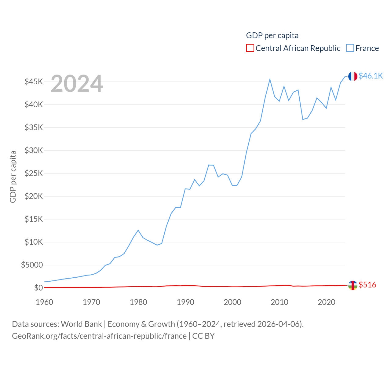 By GDP, The Central African Republic ranks 171/197 ($2.75B) and France ranks 7/197 ($3.16T). By GDP per capita, The Central African Republic ranks 195/197 ($516), while France ranks 27/197 ($46,103).