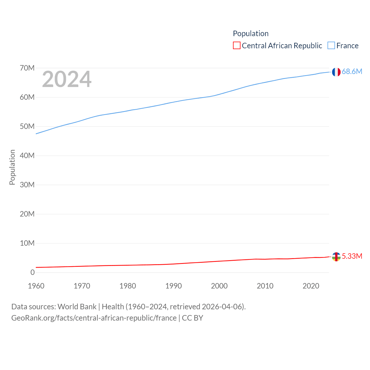 The Central African Republic has a population of 5.33M (ranked 121/197), compared with 68.6M in France (ranked 23/197). The Central African Republic's land area is 240,534 sq mi versus 208,090 sq mi for France (ranked 43rd vs. 48th).