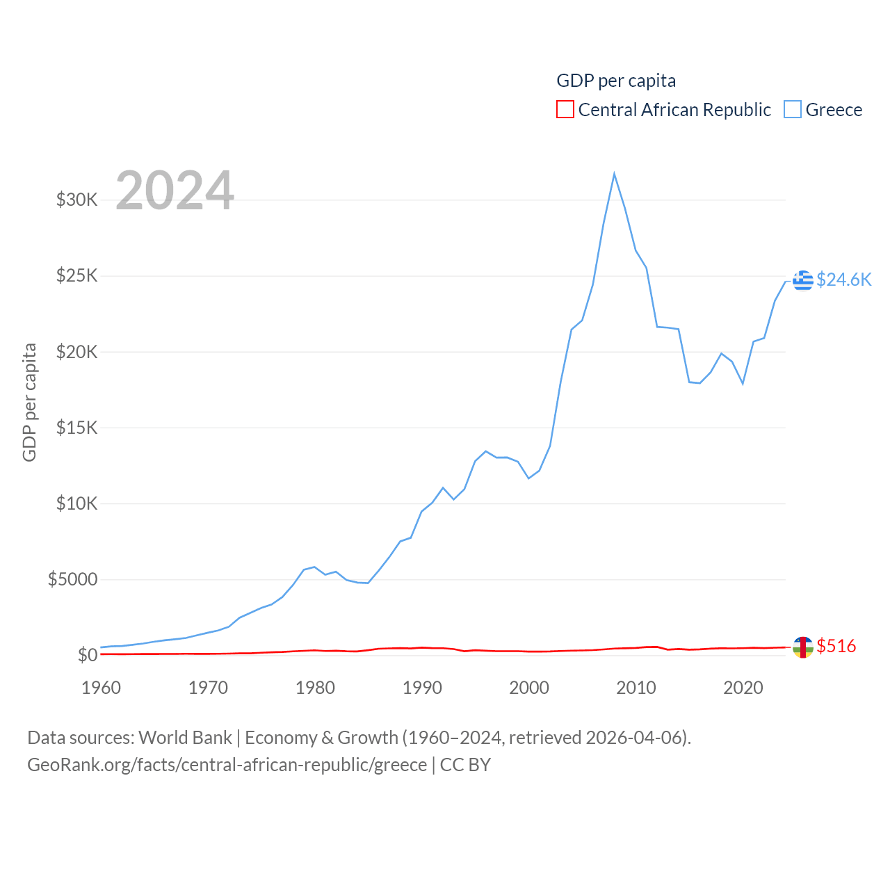 By GDP, The Central African Republic ranks 171/197 ($2.75B) and Greece ranks 53/197 ($256B). By GDP per capita, The Central African Republic ranks 195/197 ($516), while Greece ranks 49/197 ($24,626).