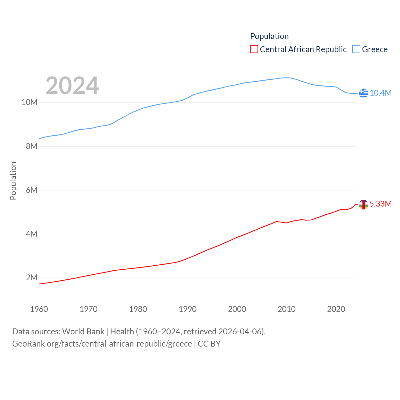 The Central African Republic has a population of 5.33M (ranked 121/197), compared with 10.4M in Greece (ranked 94/197). The Central African Republic's land area is 240,534 sq mi versus 49,769 sq mi for Greece (ranked 43rd vs. 95th).