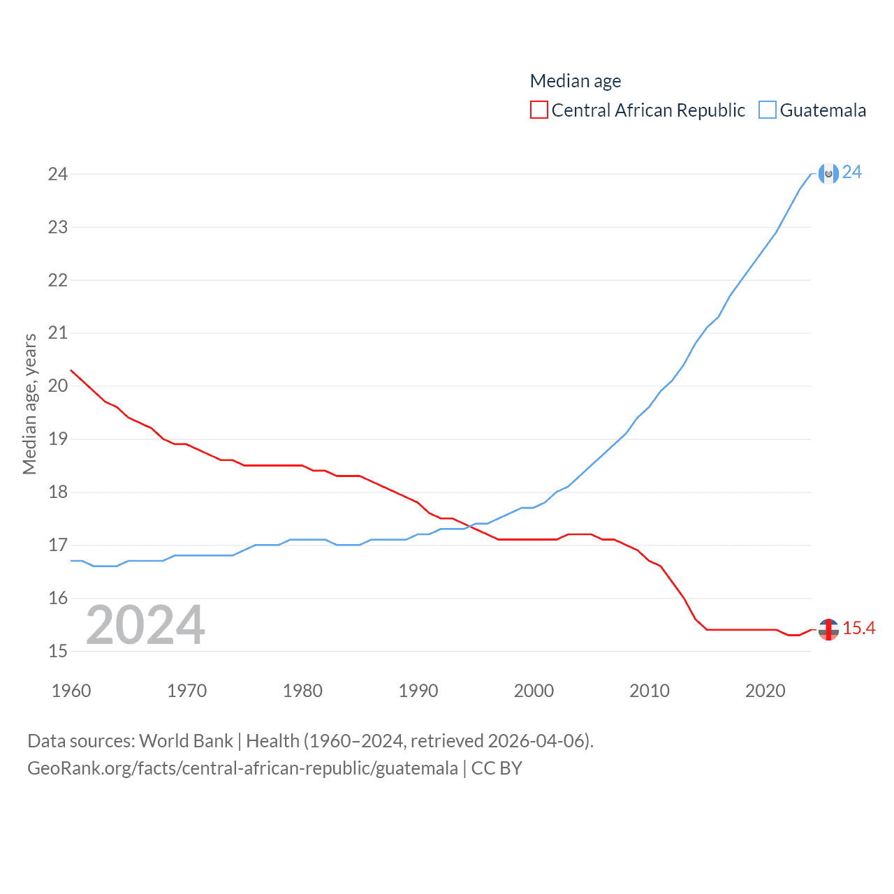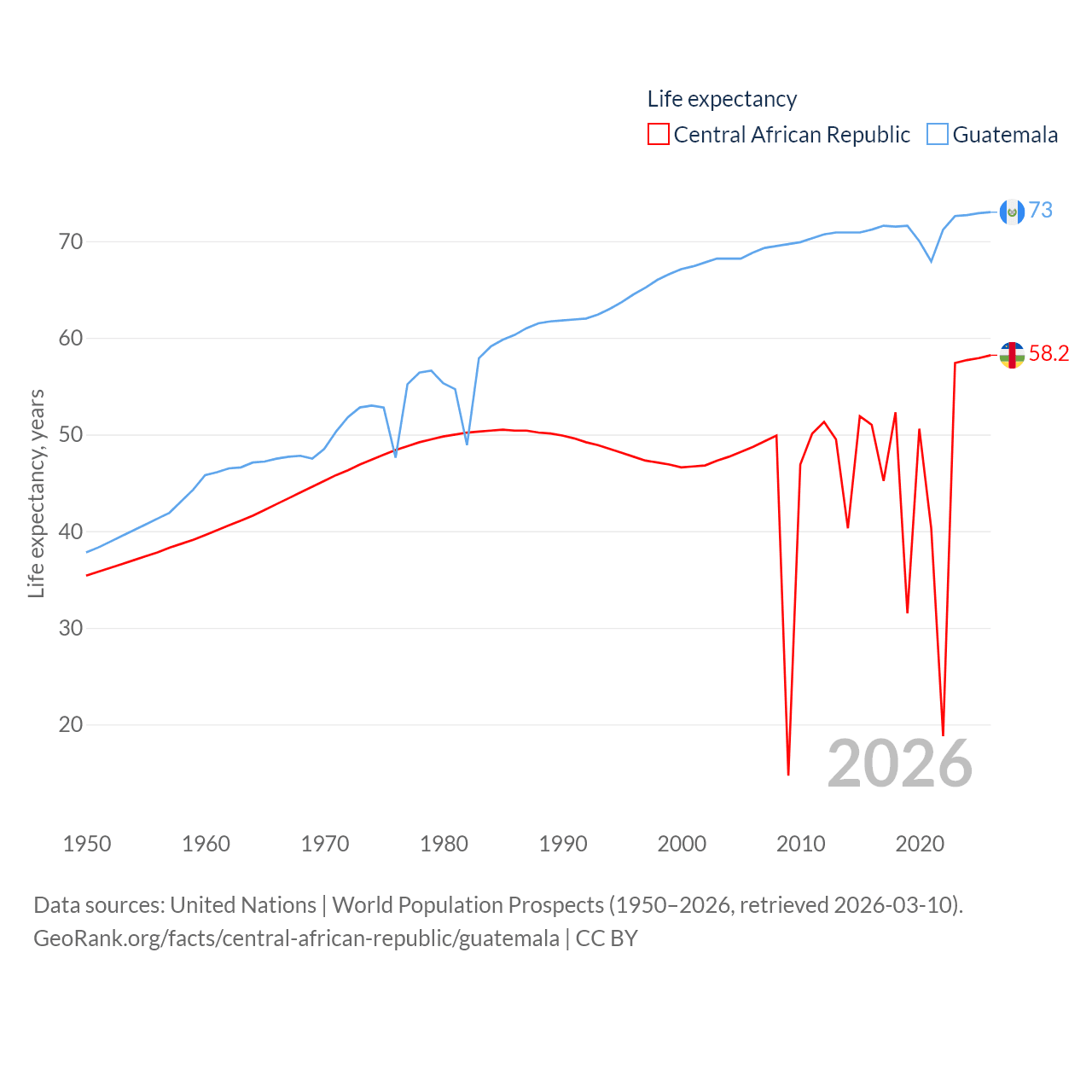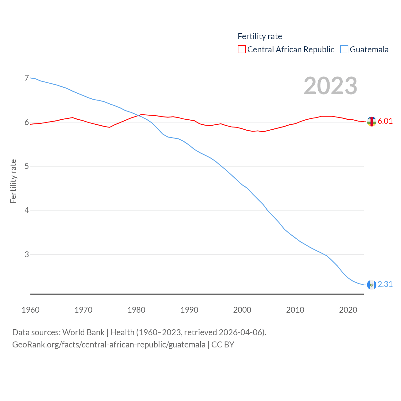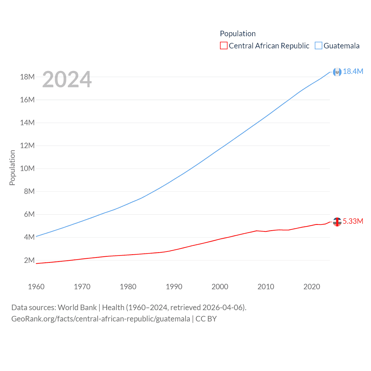 The Central African Republic has a population of 5.33M (ranked 121/197), compared with 18.4M in Guatemala (ranked 70/197). The Central African Republic's land area is 240,534 sq mi versus 41,375 sq mi for Guatemala (ranked 43rd vs. 102nd).