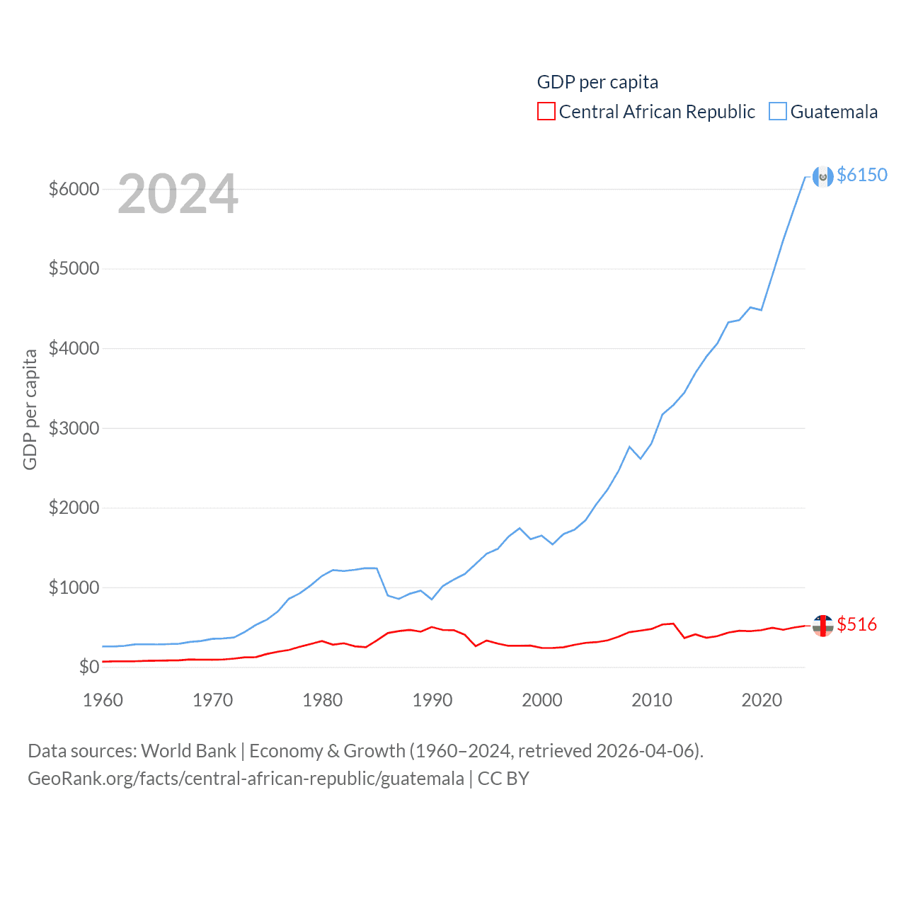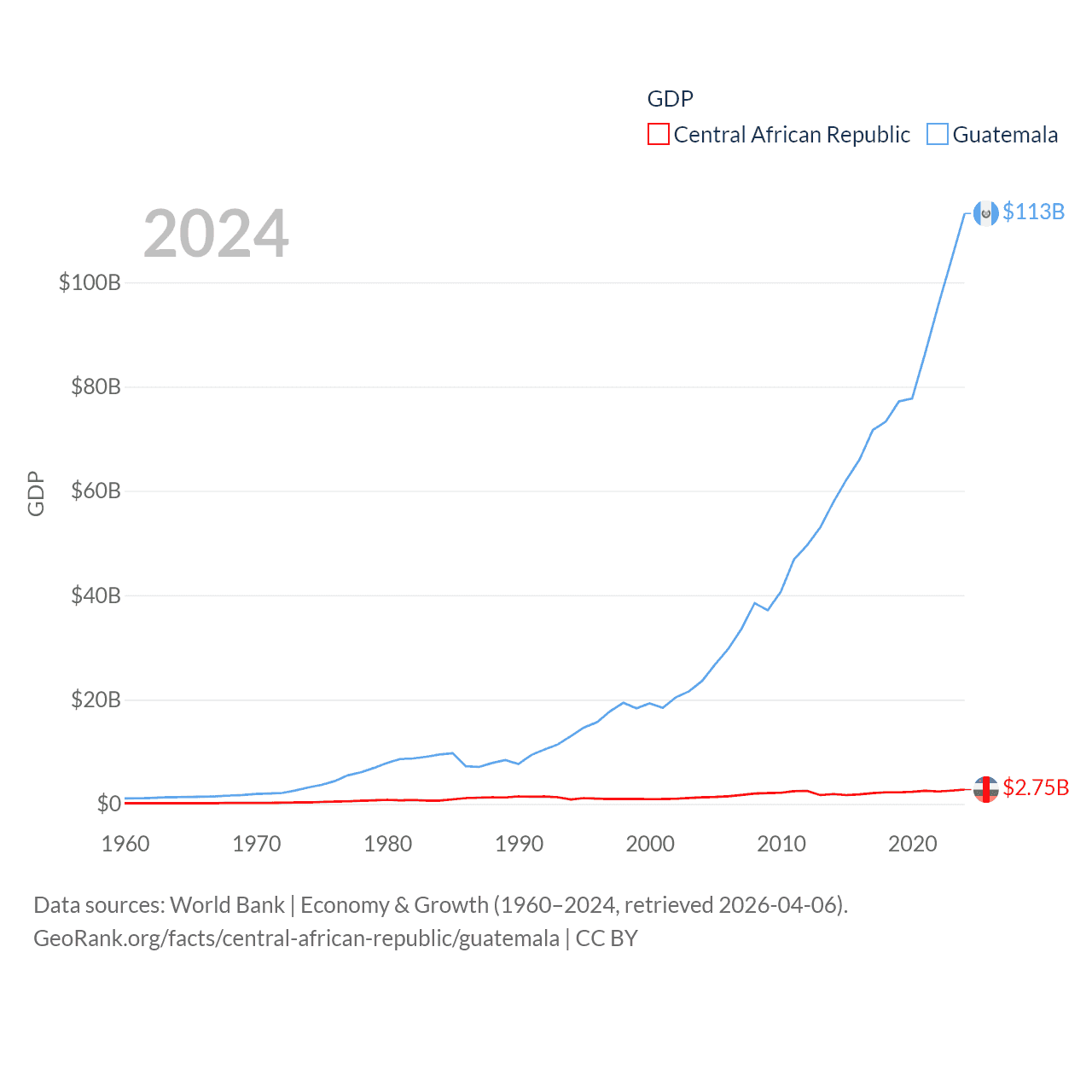 By GDP, The Central African Republic ranks 171/197 ($2.75B) and Guatemala ranks 68/197 ($113B). By GDP per capita, The Central African Republic ranks 195/197 ($516), while Guatemala ranks 112/197 ($6,150).