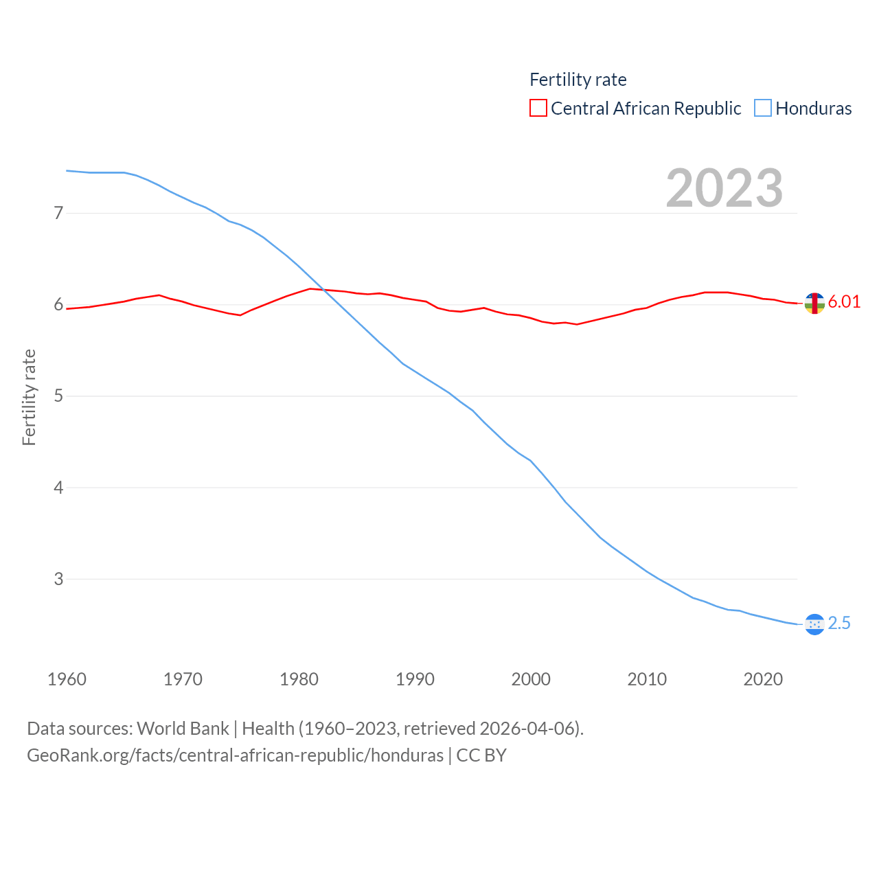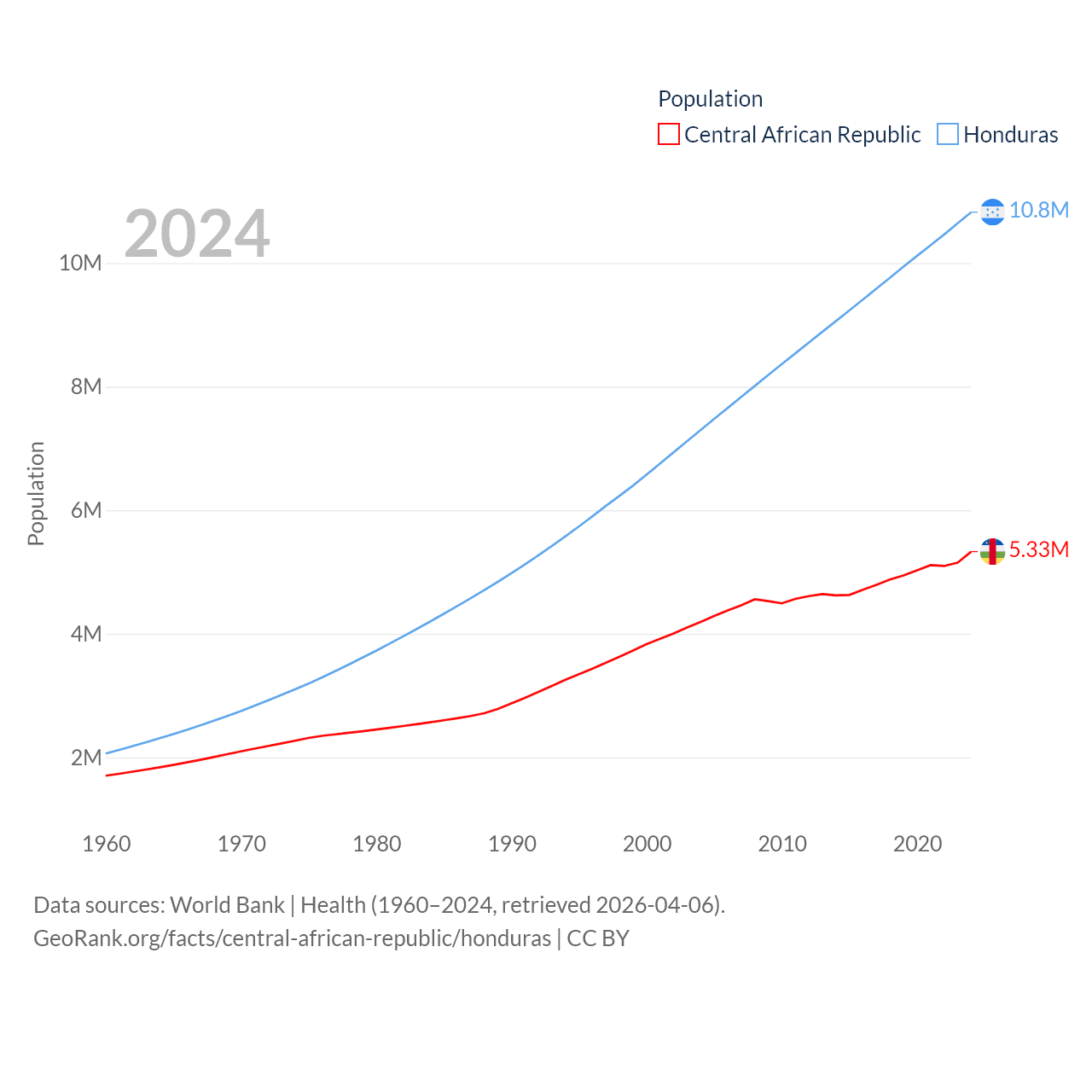 The Central African Republic has a population of 5.33M (ranked 121/197), compared with 10.8M in Honduras (ranked 89/197). The Central African Republic's land area is 240,534 sq mi versus 43,201 sq mi for Honduras (ranked 43rd vs. 100th).