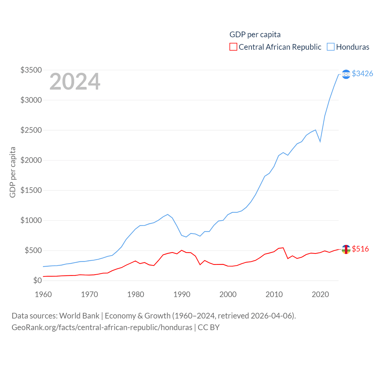 By GDP, The Central African Republic ranks 171/197 ($2.75B) and Honduras ranks 104/197 ($37.1B). By GDP per capita, The Central African Republic ranks 195/197 ($516), while Honduras ranks 136/197 ($3,426).