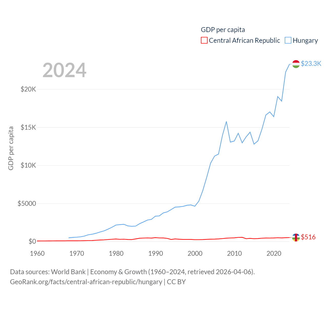 By GDP, The Central African Republic ranks 171/197 ($2.75B) and Hungary ranks 55/197 ($223B). By GDP per capita, The Central African Republic ranks 195/197 ($516), while Hungary ranks 55/197 ($23,292).