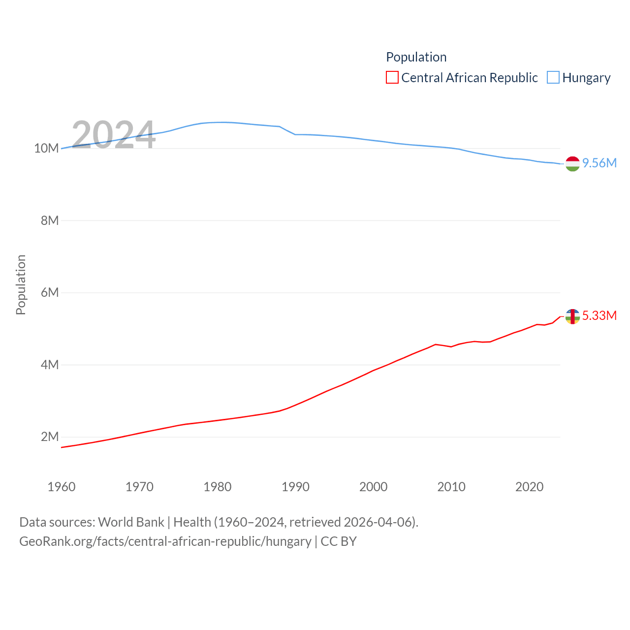 The Central African Republic has a population of 5.33M (ranked 121/197), compared with 9.56M in Hungary (ranked 97/197). The Central African Republic's land area is 240,534 sq mi versus 35,236 sq mi for Hungary (ranked 43rd vs. 109th).